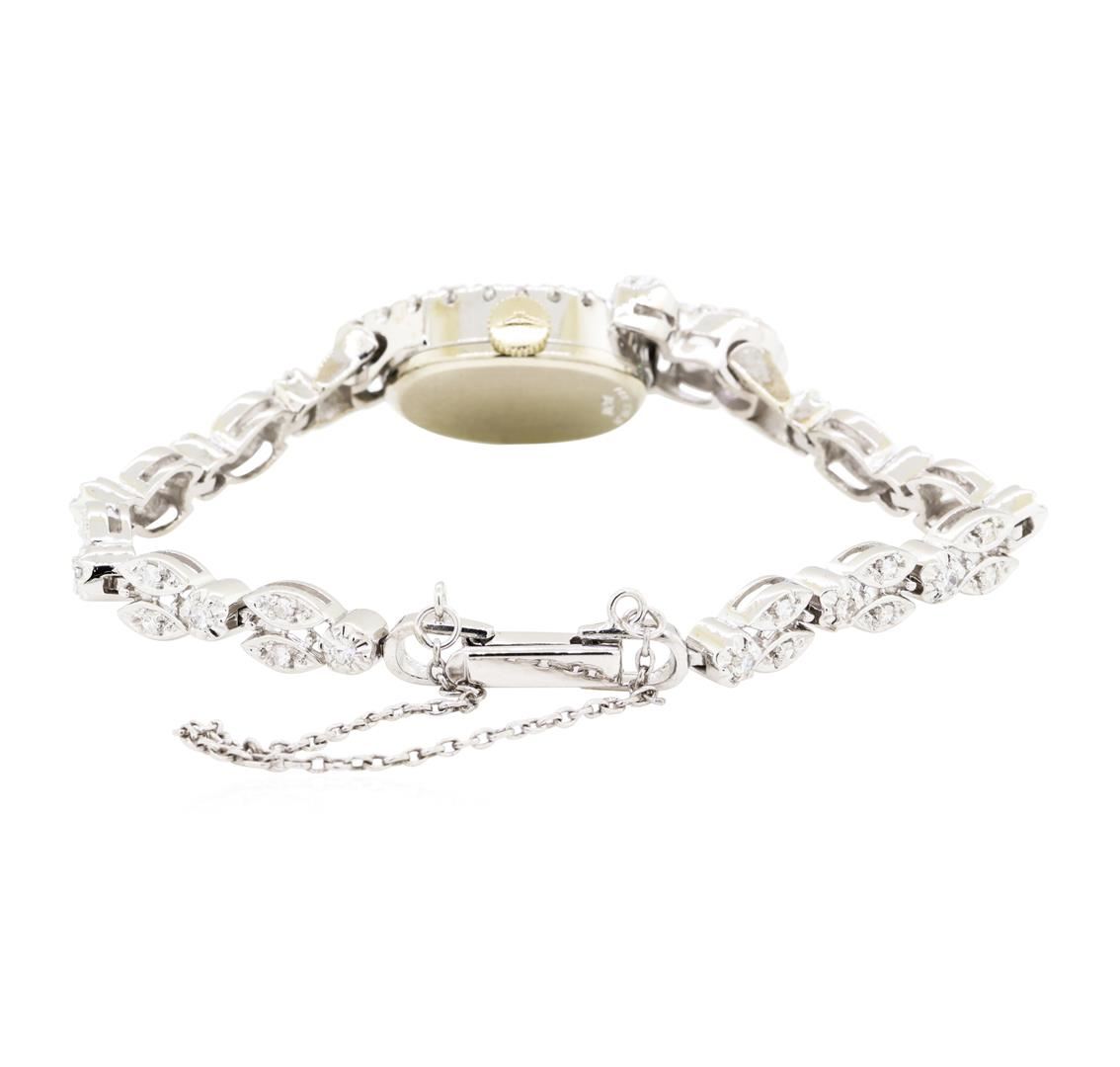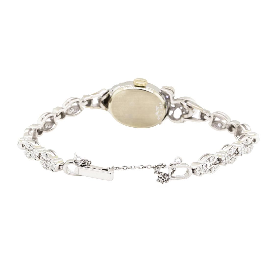 One lady's, combination cast & assembled Longines oval case wrist watch electronically tested 14KT white gold, Crown: pull-out, Crystal: acrylic, Movement: 17 jewel manual wind, Dial: silver brushed with baton, pointed type hands and stick and dot marker numerals, Bracelet: matching, Condition: G-5 fine. The attached bracelet measures approximately six inches in length and has an attached safety chain. Containing: One prong set round brilliant cut diamond, measuring 2.45 - 2.40 x 1.51mm (depth est.) approximate weight of 0.06ct. Graded in the setting. Color H Clarity VS-2 Cut Good Fifty-Eight prong set single cut diamonds, measuring 2.00 - 1.30 x 1.02mm (depth est.) approximate total weight of 58 Stones = 1.00ct. Graded in the setting. Color G - H Clarity VS-1 to VS-2 Cut Very Good. Total Weight of Diamonds 1.06ct.. Total Weight of Watch 19.00gm GAS Appraised at $4865.00. GAS Appraised at $4,865.00.