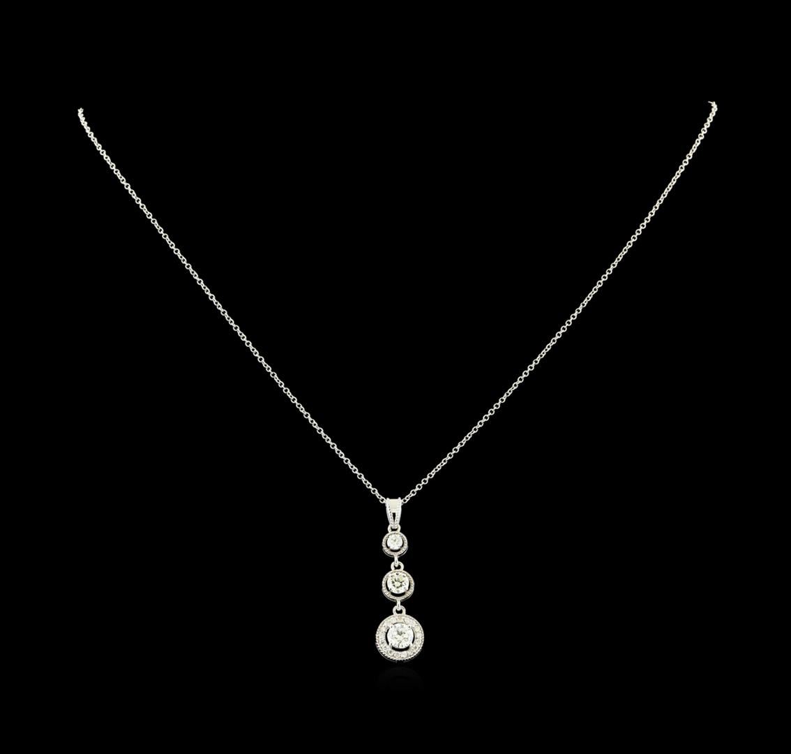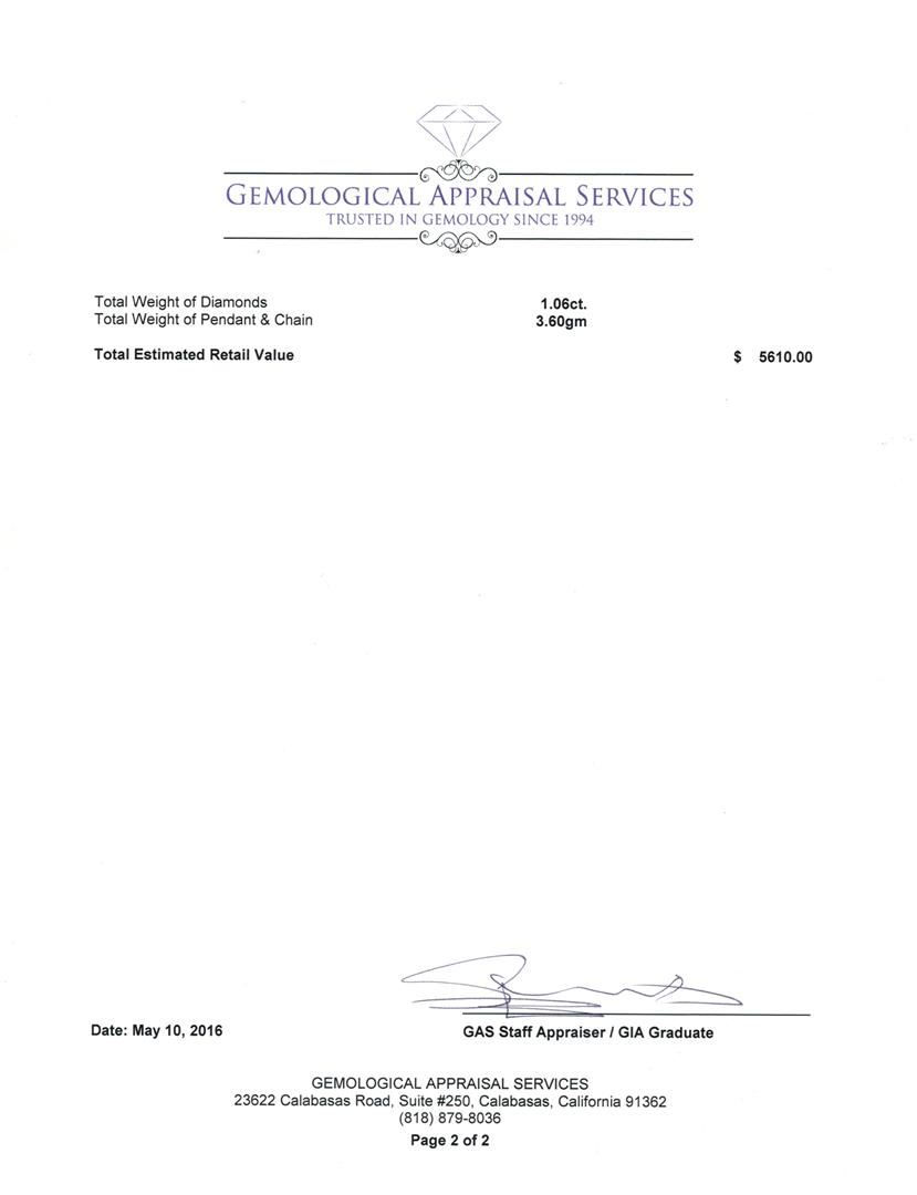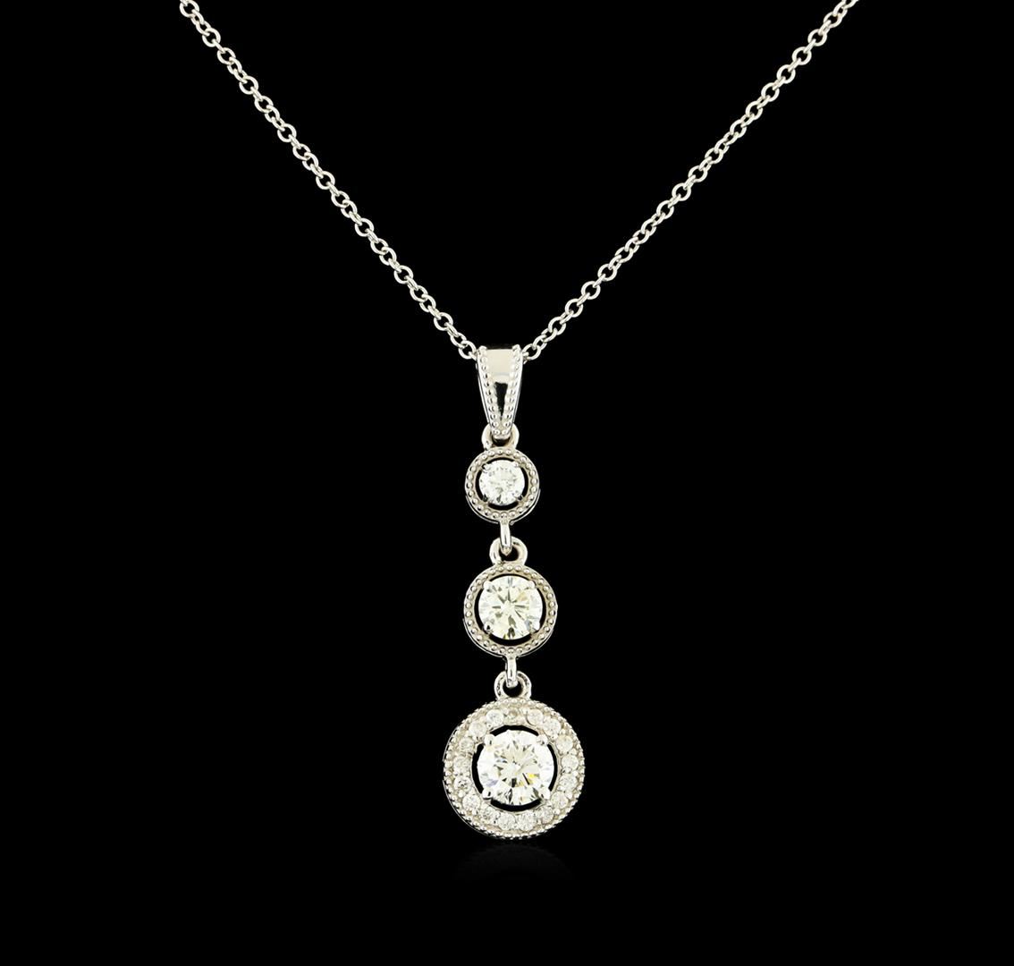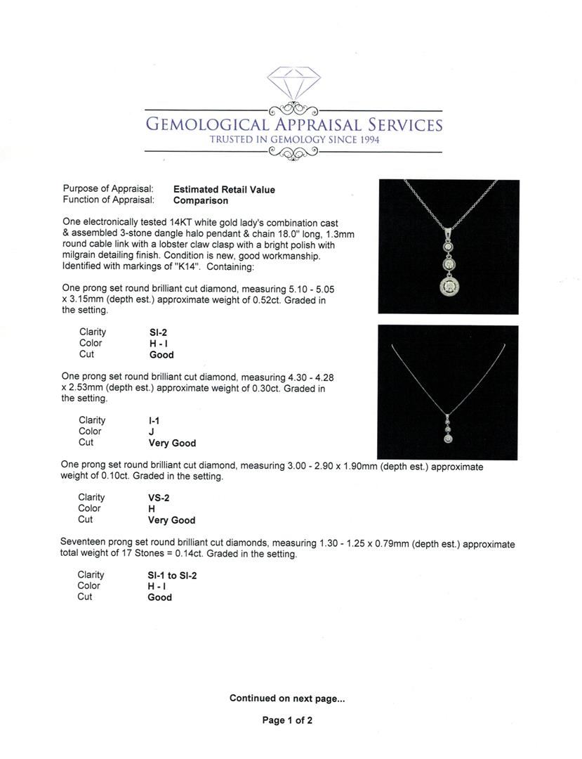 One electronically tested 14KT white gold lady's combination cast & assembled 3-stone dangle halo pendant & chain 18.0" long, 1.3mm round cable link with a lobster claw clasp with a bright polish with milgrain detailing finish. Identified with markings of "K14". Condition is new, good workmanship. Containing: One prong set round brilliant cut diamond, measuring 5.10 - 5.05 x 3.15mm (depth est.) approximate weight of 0.52ct. Graded in the setting. Clarity: SI-2. Color: H - I. Cut Good One prong set round brilliant cut diamond, measuring 4.30 - 4.28 x 2.53mm (depth est.) approximate weight of 0.30ct. Graded in the setting. Clarity: I-1. Color: J. Cut Very Good One prong set round brilliant cut diamond, measuring 3.00 - 2.90 x 1.90mm (depth est.) approximate weight of 0.10ct. Graded in the setting. Clarity: VS-2. Color: Very Good Seventeen prong set round brilliant cut diamonds, measuring 1.30 - 1.25 x 0.79mm (depth est.) approximate total weight of 17 Stones = 0.14ct. Graded in the setting. Clarity: SI-1 to SI-2. Color: H - I. Cut Good. Total Weight of Diamonds 1.06ct. Total Weight of Pendant & Chain 3.60gm. GAS Appraised at $5,610.00.
