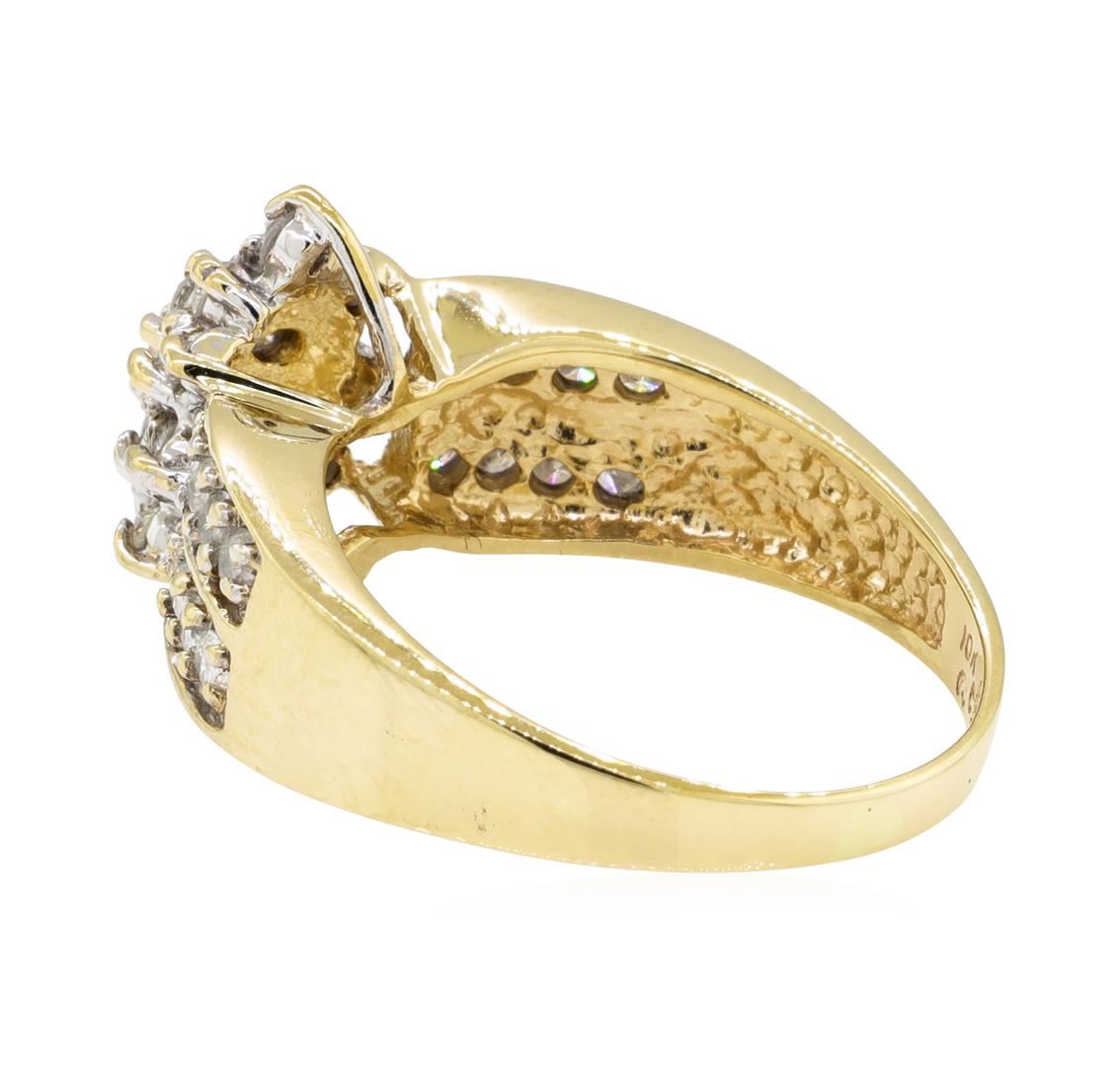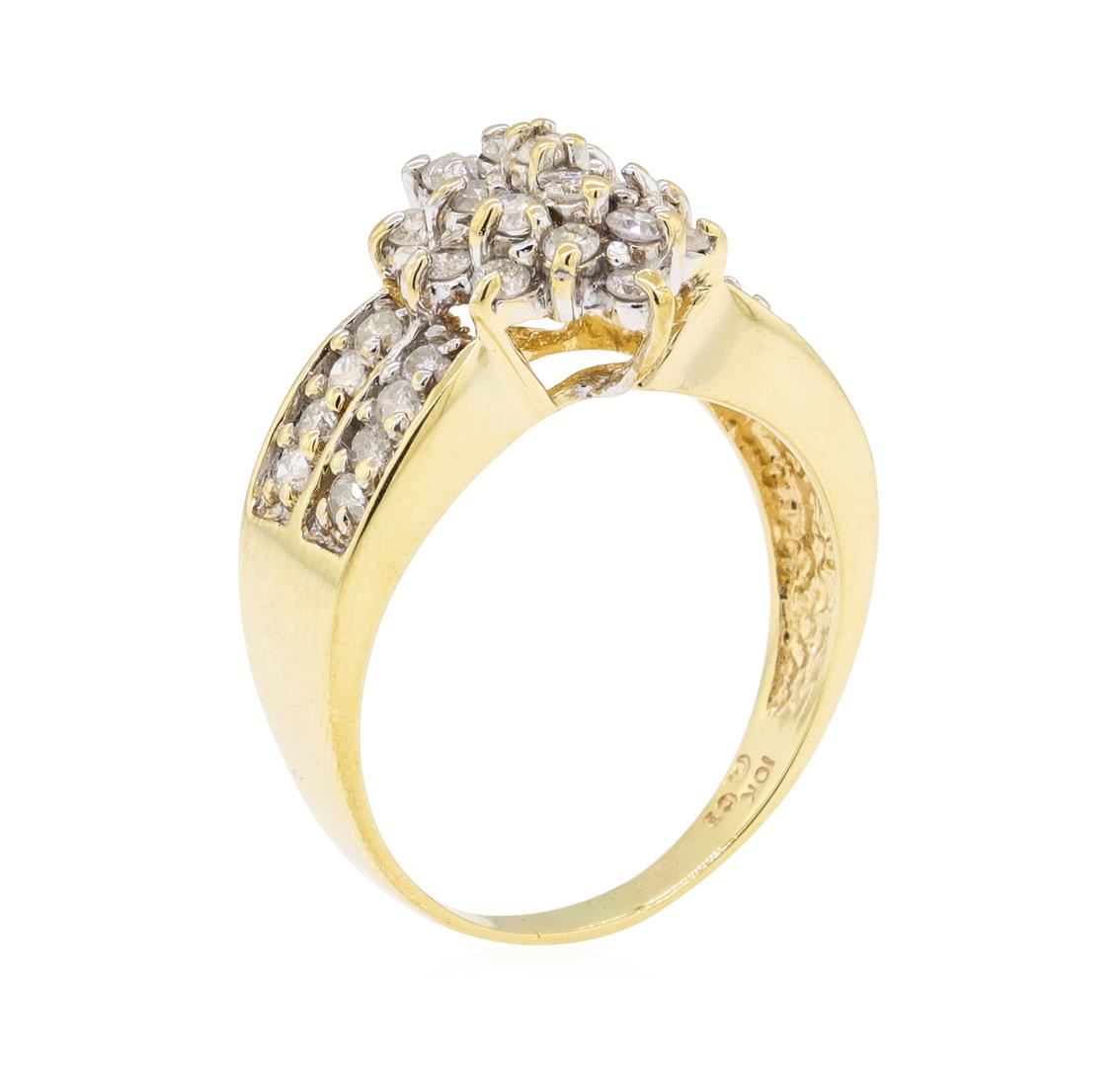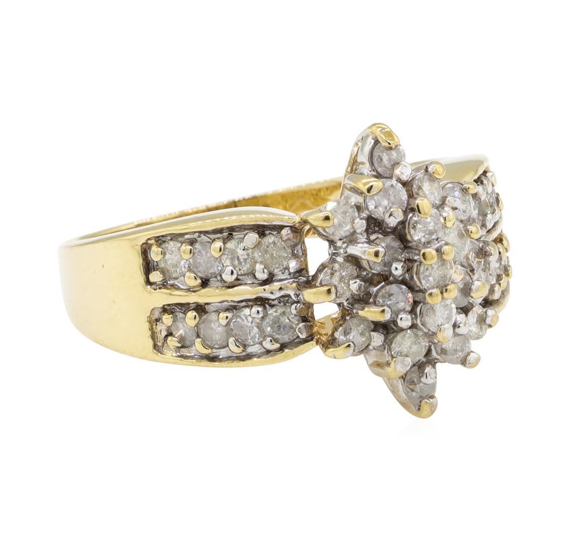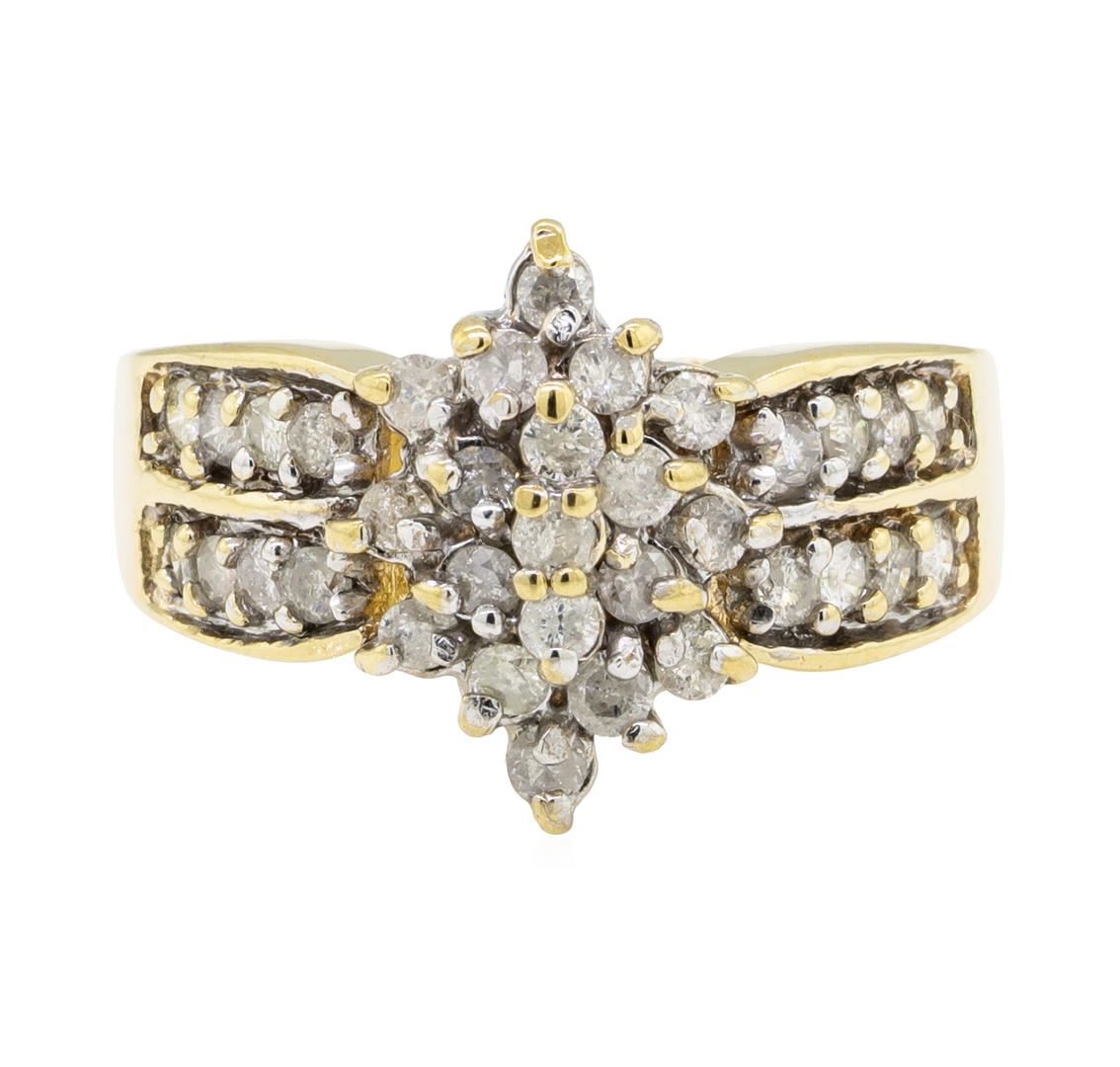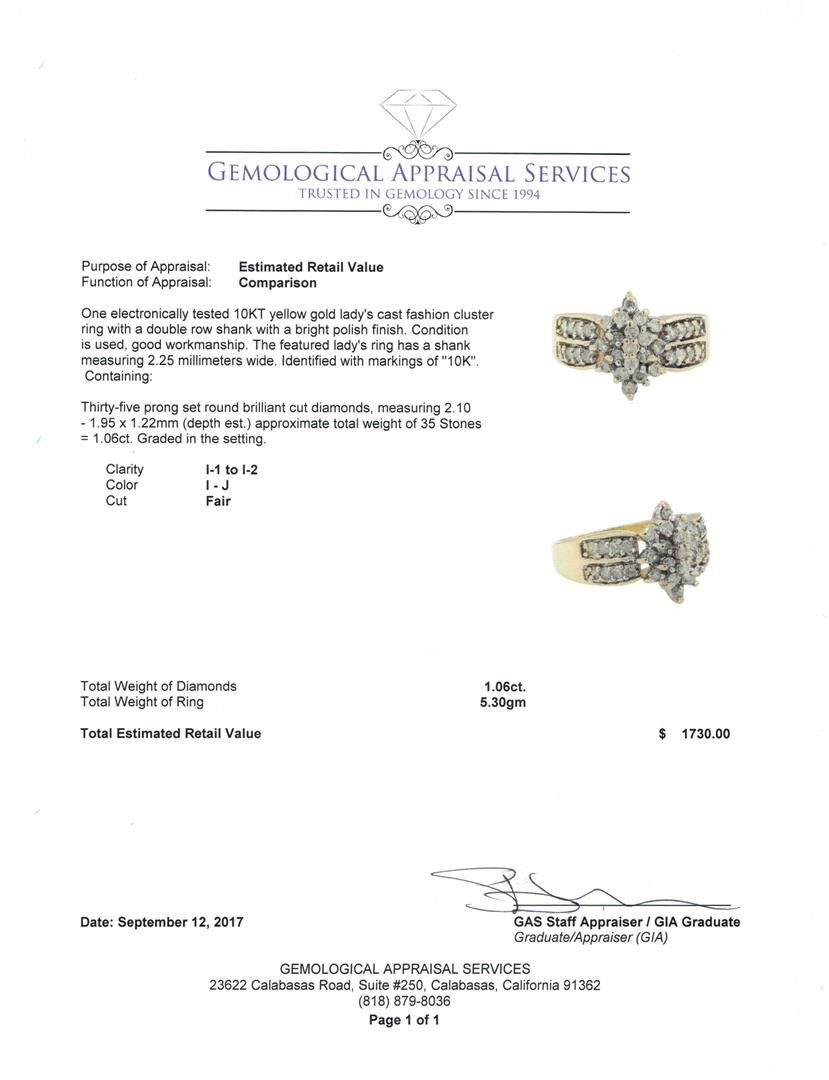 One electronically tested 10KT yellow gold lady's cast fashion cluster ring with a double row shank with a bright polish finish. The featured lady's ring has a shank measuring 2.25 millimeters wide. Identified with markings of '10K'. Condition is used, good workmanship. Containing: Thirty-Five prong set round brilliant cut diamonds, measuring 2.10 - 1.95 x 1.22mm (depth est.) approximate total weight of 35 Stones = 1.06ct. Graded in the setting. Color I - J Clarity I-1 to I-2 Cut Fair. Total Weight of Diamonds 1.06ct.. Total Weight of Ring 5.30gm GAS Appraised at $1730.00. GAS Appraised at $1,730.00.