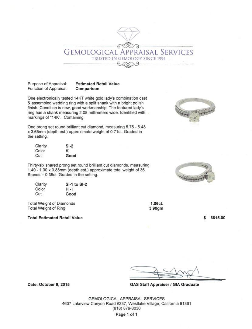 One electronically tested 14KT white gold lady's combination cast & assembled wedding ring with a split shank with a bright polish finish. The featured lady's ring has a shank measuring 2.08 millimeters wide. Identified with markings of "14K". Condition is new, good workmanship. Containing: One prong set round brilliant cut diamond, measuring 5.75 - 5.48 x 3.65mm (depth est.) approximate weight of 0.71ct. Graded in the setting. Clarity: SI-2. Color: K. Cut Good Thirty-Six shared prong set round brilliant cut diamonds, measuring 1.40 - 1.30 x 0.88mm (depth est.) approximate total weight of 36 Stones = 0.35ct. Graded in the setting. Clarity: SI-1 to SI-2. Color: H - I. Cut Good. Total Weight of Diamonds 1.06ct. Total Weight of Ring 3.90gm. GAS Appraised at $6,615.00.