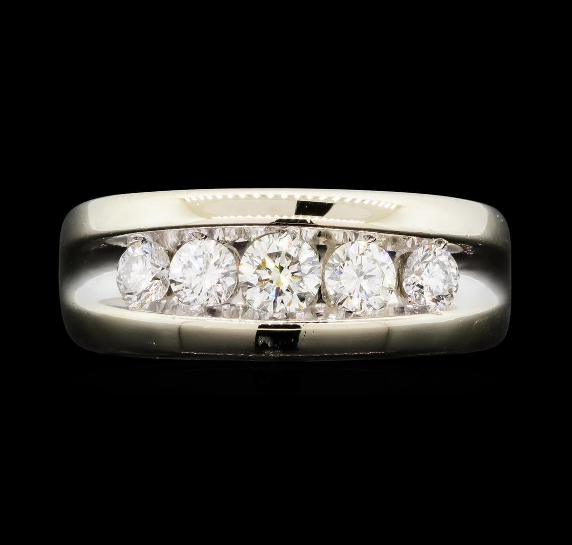 One electronically tested 14KT white gold lady's cast 5-stone wedding ring with a tapered shank with a bright polish finish. The featured lady's ring has a shank measuring 4.00 millimeters wide. Identified with markings of '14K'. Condition is new, good workmanship. Containing: One channel set round brilliant cut diamond, measuring 4.40 - 4.35 x 2.64mm (depth est.) approximate weight of 0.31ct. Graded in the setting. Color J Clarity SI-1 Cut Good Two channel set round brilliant cut diamonds, measuring 3.90 - 3.80 x 2.39mm (depth est.) approximate total weight of 2 Stones = 0.43ct. Graded in the setting. Color I - J Clarity SI-1 to SI-2 Cut Good Two channel set round brilliant cut diamonds, measuring 3.50 - 3.40 x 2.14mm (depth est.) approximate total weight of 2 Stones = 0.32ct. Graded in the setting. Color I - J Clarity SI-1 to SI-2 Cut Good. Total Weight of Diamonds 1.06ct.. Total Weight of Ring 5.90gm GAS Appraised at $4,690.00.