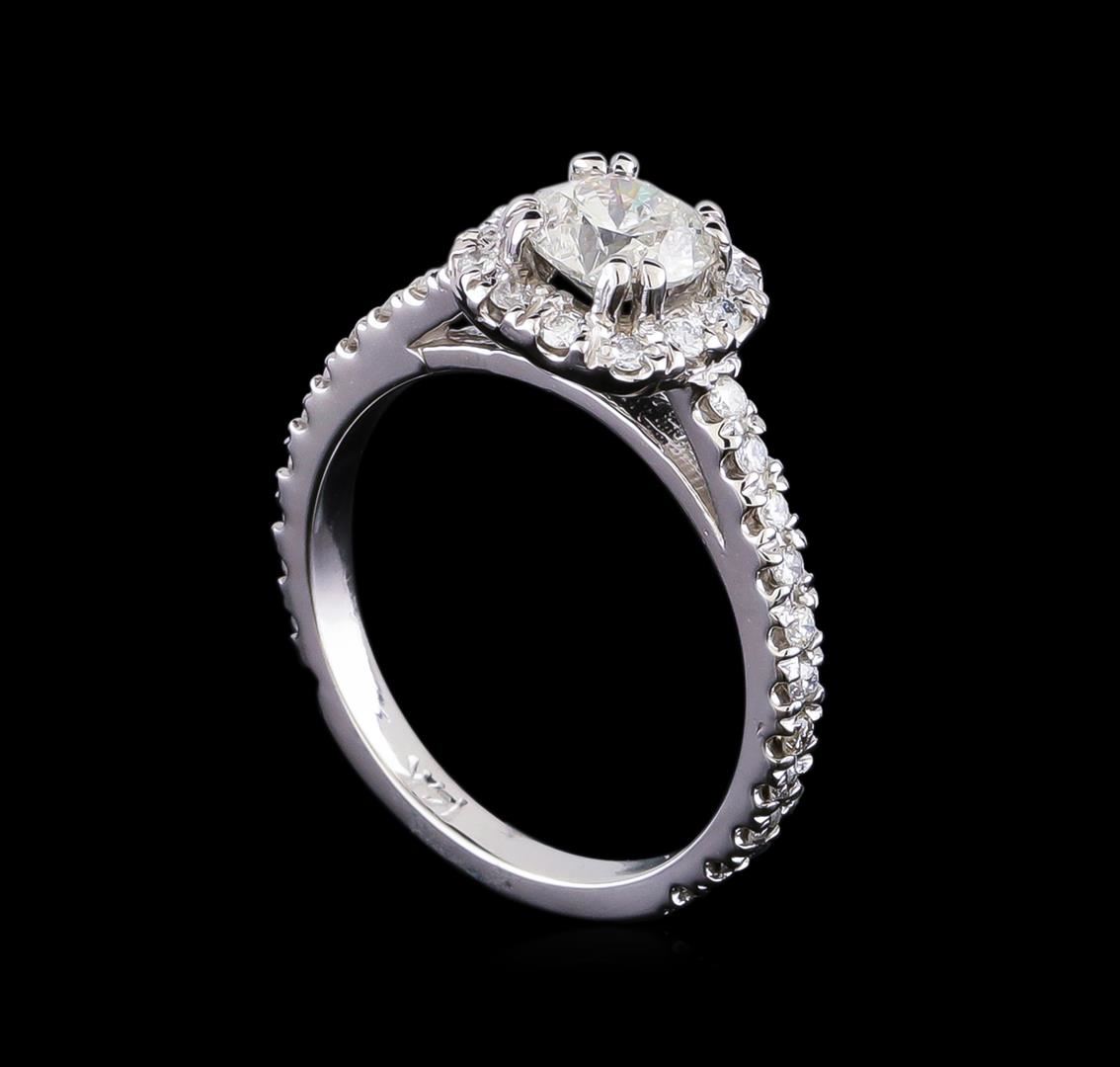 One electronically tested 14KT white gold lady's cast wedding ring with a cushion halo with a bright polish finish. The featured lady's ring has a shank measuring 2.00 millimeters in width. Identified with markings of "14K". Condition is new, good workmanship. Containing: One prong set round brilliant cut diamond, measuring 5.62 - 5.60 x 3.48mm (depth est.) , 5.00.%. GTCF approximate weight of 0.72ct. Graded in the setting. Clarity: I-1. Color: I. Cut Very Good Thirty-Four prong set round brilliant cut diamonds, measuring 1.40 - 1.30 x 0.84mm (depth est.) approximate total weight of 34 Stones = 0.34ct. Graded in the setting. Clarity: SI-1 to SI-2. Color: H - I. Cut Good. Total Weight of Diamonds 1.06ct. Total Weight of Ring 3.10gm GAS Appraised at $5,865.00.