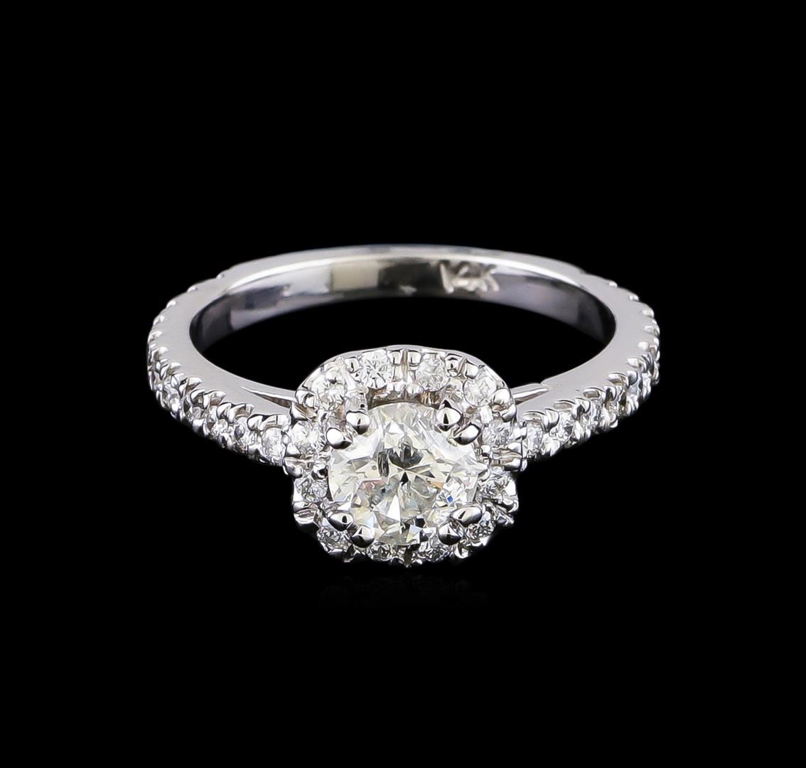 One electronically tested 14KT white gold lady's cast wedding ring with a cushion halo with a bright polish finish. The featured lady's ring has a shank measuring 2.00 millimeters in width. Identified with markings of "14K". Condition is new, good workmanship. Containing: One prong set round brilliant cut diamond, measuring 5.62 - 5.60 x 3.48mm (depth est.) , 5.00.%. GTCF approximate weight of 0.72ct. Graded in the setting. Clarity: I-1. Color: I. Cut Very Good Thirty-Four prong set round brilliant cut diamonds, measuring 1.40 - 1.30 x 0.84mm (depth est.) approximate total weight of 34 Stones = 0.34ct. Graded in the setting. Clarity: SI-1 to SI-2. Color: H - I. Cut Good. Total Weight of Diamonds 1.06ct. Total Weight of Ring 3.10gm GAS Appraised at $5,865.00.
