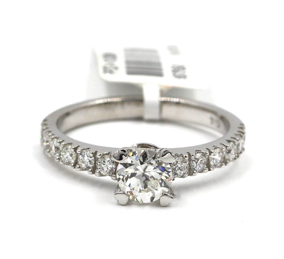 One lady's ring featuring: 14KT white gold weighing 2.82 grams containing one center diamond weighing 0.65ct and 12 side diamonds weighing 0.41ctw. The centerdiamond is round brilliant cut with SI1 clarity, H-I color and very good cut. The side diamonds a