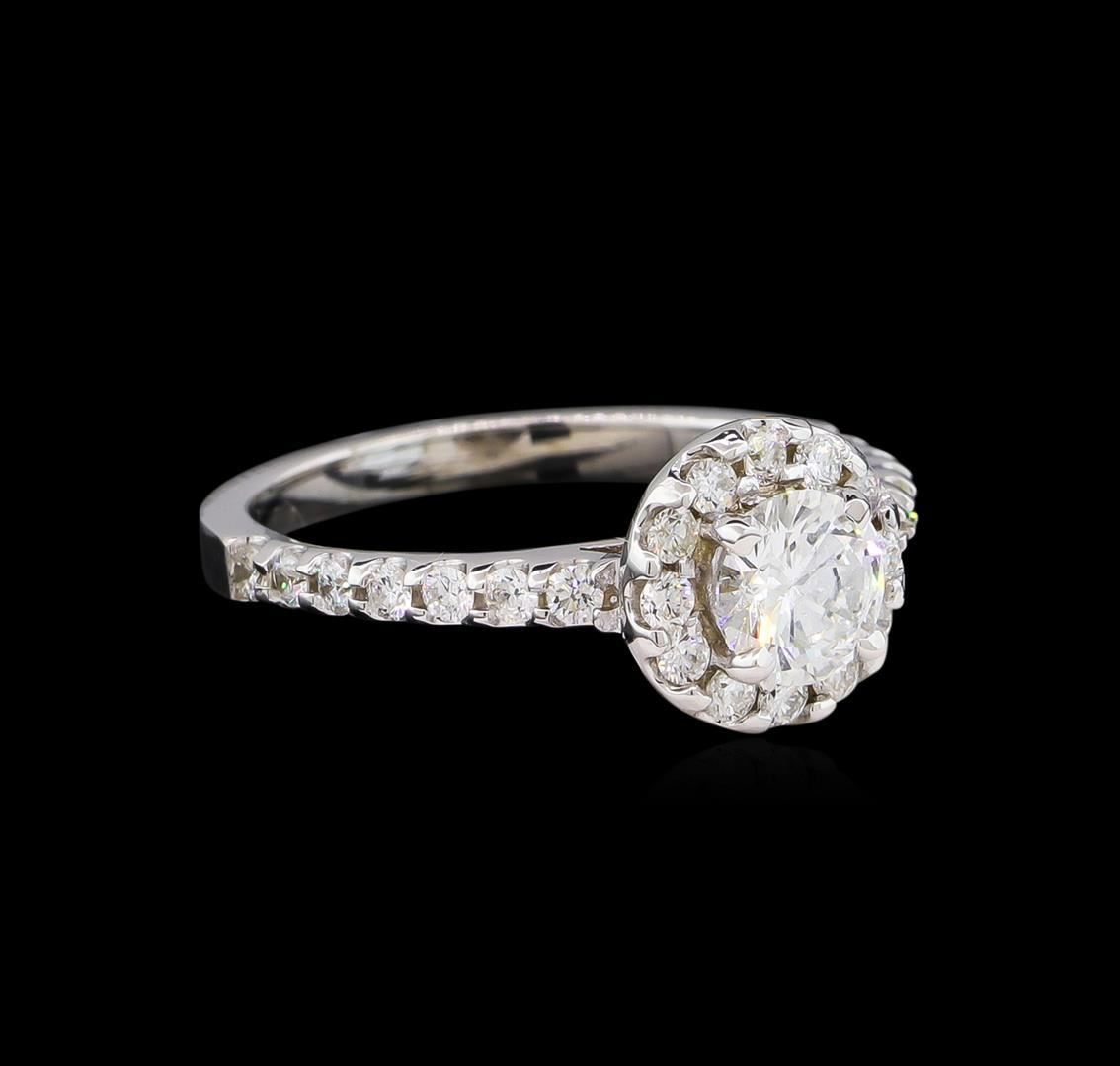 One electronically tested 14KT white gold lady's cast wedding ring with a cathedral halo with a bright polish finish. The featured lady's ring has a shank measuring 1.99 millimeters wide. Identified with markings of "14K". Condition is new, good workmanship. Containing: One prong set round brilliant cut diamond, measuring 5.47 - 5.46 x 3.34mm (depth est.) approximate weight of 0.61ct. Graded in the setting. Clarity: SI-2. Color: G. Cut Very Good Twenty-Six prong set round brilliant cut diamonds, measuring 1.70 - 1.60 x 1.02mm (depth est.) approximate total weight of 26 Stones = 0.45ct. Graded in the setting. Clarity: SI-1 to SI-2. Color: G - I. Cut Good. Total Weight of Diamonds 1.06ct. Total Weight of Ring 3.10gm GAS Appraised.