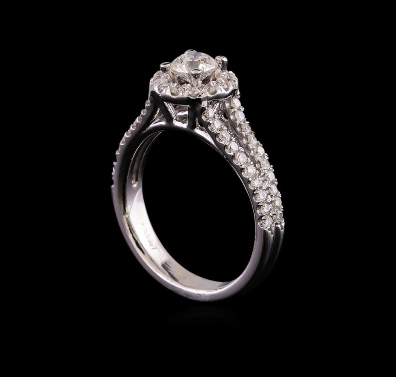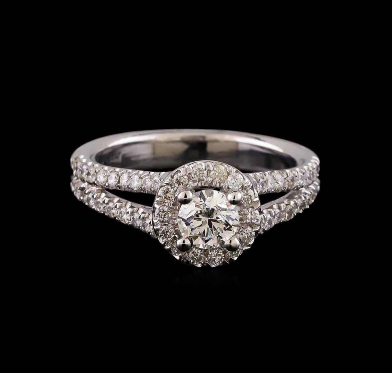 One electronically tested 14KT white gold lady's cast wedding ring with a split shank halo with a bright polish finish. The featured lady's ring has a double shank measuring 3.41 millimeters wide. Identified with markings of "14K". Condition is new, good workmanship. Containing: One prong set round brilliant cut diamond, measuring 4.96 - 4.95 x 3.24mm (depth est.) , 3.00.%. GTCF approximate weight of 0.52ct. Graded in the setting. Clarity: SI-2. Color: G. Cut Very Good Fifty-Four prong set round brilliant cut diamonds, measuring 1.40 - 1.35 x 0.86mm (depth est.) approximate total weight of 54 Stones = 0.54ct. Graded in the setting. Clarity: SI-1 to SI-2. Color: G - Good. Total Weight of Diamonds 1.06ct. Total Weight of Ring 5.10gm. GAS Appraised.