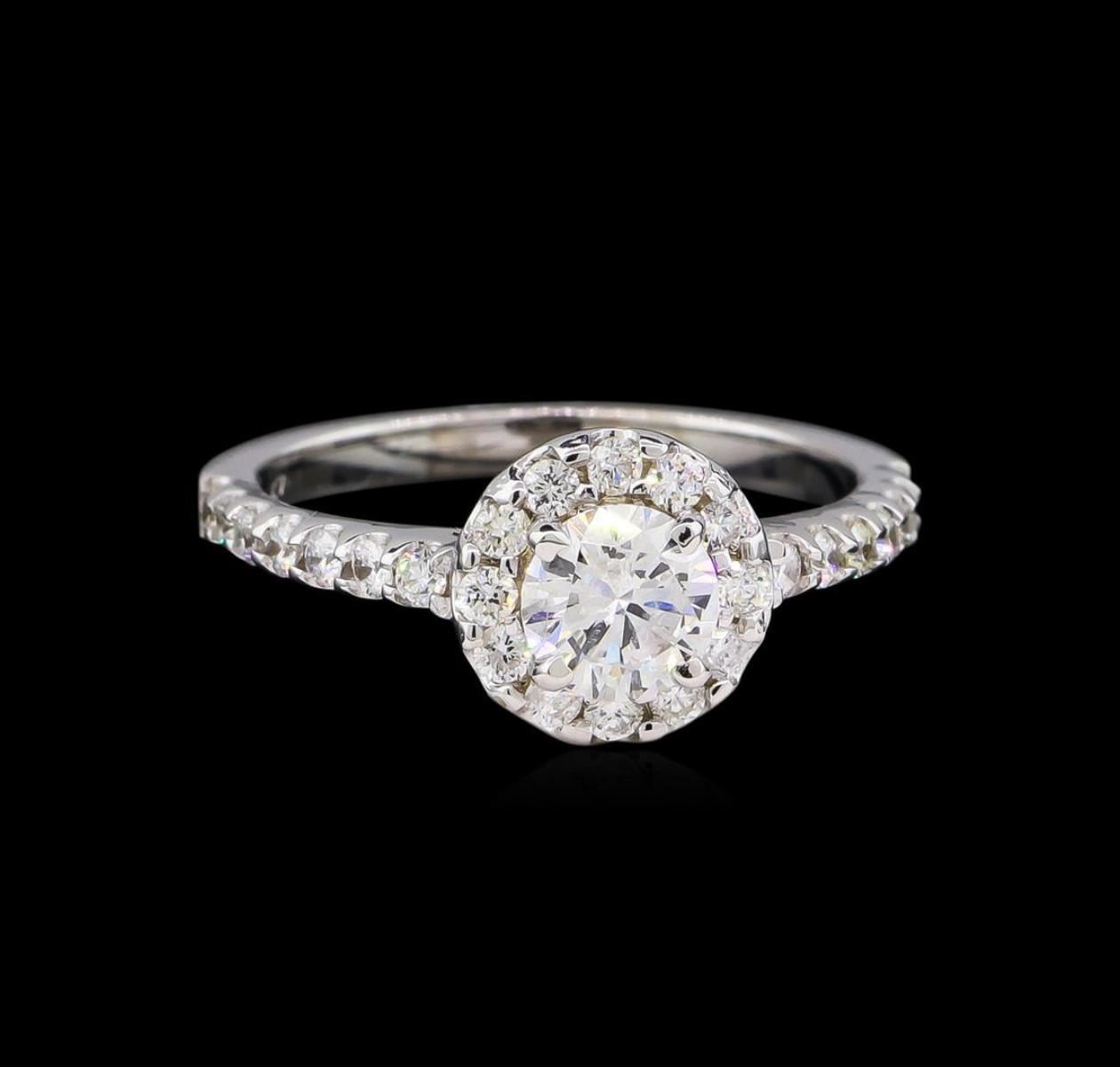 One electronically tested 14KT white gold lady's cast wedding ring with a cathedral halo with a bright polish finish. The featured lady's ring has a shank measuring 1.99 millimeters wide. Identified with markings of "14K". Condition is new, good workmanship. Containing: One prong set round brilliant cut diamond, measuring 5.47 - 5.46 x 3.34mm (depth est.) approximate weight of 0.61ct. Graded in the setting. Clarity: SI-2. Color: G. Cut Very Good Twenty-Six prong set round brilliant cut diamonds, measuring 1.70 - 1.60 x 1.02mm (depth est.) approximate total weight of 26 Stones = 0.45ct. Graded in the setting. Clarity: SI-1 to SI-2. Color: G - I. Cut Good. Total Weight of Diamonds 1.06ct. Total Weight of Ring 3.10gm GAS Appraised.