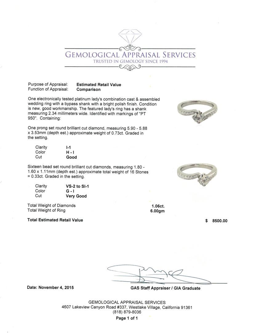 One electronically tested platinum lady's combination cast & assembled wedding ring with a bypass shank with a bright polish finish. The featured lady's ring has a shank measuring 2.34 millimeters wide. Identified with markings of "PT 950". Condition is new, good workmanship. Containing: One prong set round brilliant cut diamond, measuring 5.90 - 5.88 x 3.53mm (depth est.) approximate weight of 0.73ct. Graded in the setting. Clarity: I-1. Color: H - I. Cut Good Sixteen bead set round brilliant cut diamonds, measuring 1.80 - 1.60 x 1.11mm (depth est.) approximate total weight of 16 Stones = 0.33ct. Graded in the setting. Clarity: VS-2 to SI-1. Color: G - I. Cut Very Good. Total Weight of Diamonds 1.06ct. Total Weight of Ring 6.00gm GAS Appraised at $8,500.00.