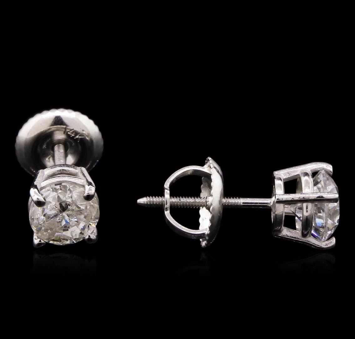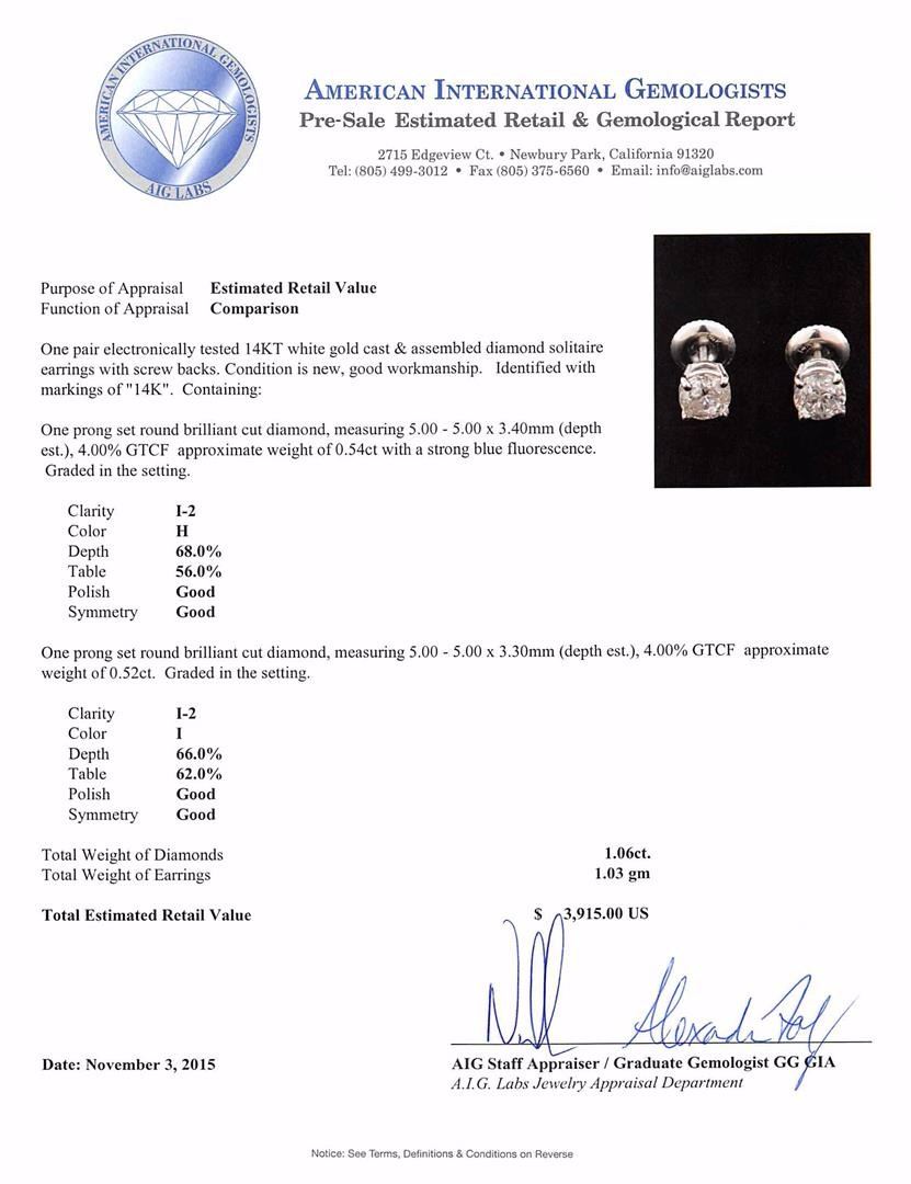 One pair electronically tested 14KT white gold cast & assembled diamond solitaire earrings with screw backs. Identified with markings of "14K". Condition is new, good workmanship. Containing: One prong set round brilliant cut diamond, measuring 5.00 - 5.00 x 3.40mm (depth est.), 4.00% GTCF approximate weight of 0.54ct with a strong blue fluorescence. Graded in the setting. Clarity: I-2. Color: 68.0%. Table 56.0%. One prong set round brilliant cut diamond, measuring 5.00 - 5.00 x 3.30mm (depth est.), 4.00% GTCF approximate weight of 0.52ct. Graded in the setting. Clarity: I-2. Color: I. Depth 66.0%. Table 62.0%. Total Weight of Diamonds 1.06ct. Total Weight of Earrings 1.03gm. AIG Appraised at $3,915.00.