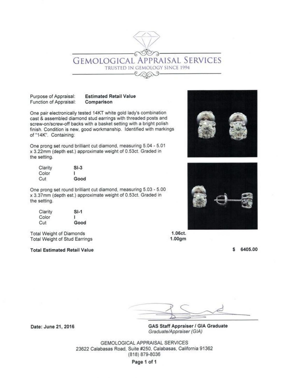 One pair electronically tested 14KT white gold lady's combination cast & assembled diamond stud earrings with threaded posts and screw-on/screw-off backs with a basket setting with a bright polish finish. Identified with markings of "14K". Condition is new, good workmanship. Containing: One prong set round brilliant cut diamond, measuring 5.04 - 5.01 x 3.22mm (depth est.) approximate weight of 0.53ct. Graded in the setting. Clarity: SI-3. Color: I. Cut Good One prong set round brilliant cut diamond, measuring 5.03 - 5.00 x 3.37mm (depth est.) approximate weight of 0.53ct. Graded in the setting. Clarity: SI-1. Color: I. Cut Good. Total Weight of Diamonds 1.06ct. Total Weight of Stud Earrings 1.00gm. GAS Appraised.