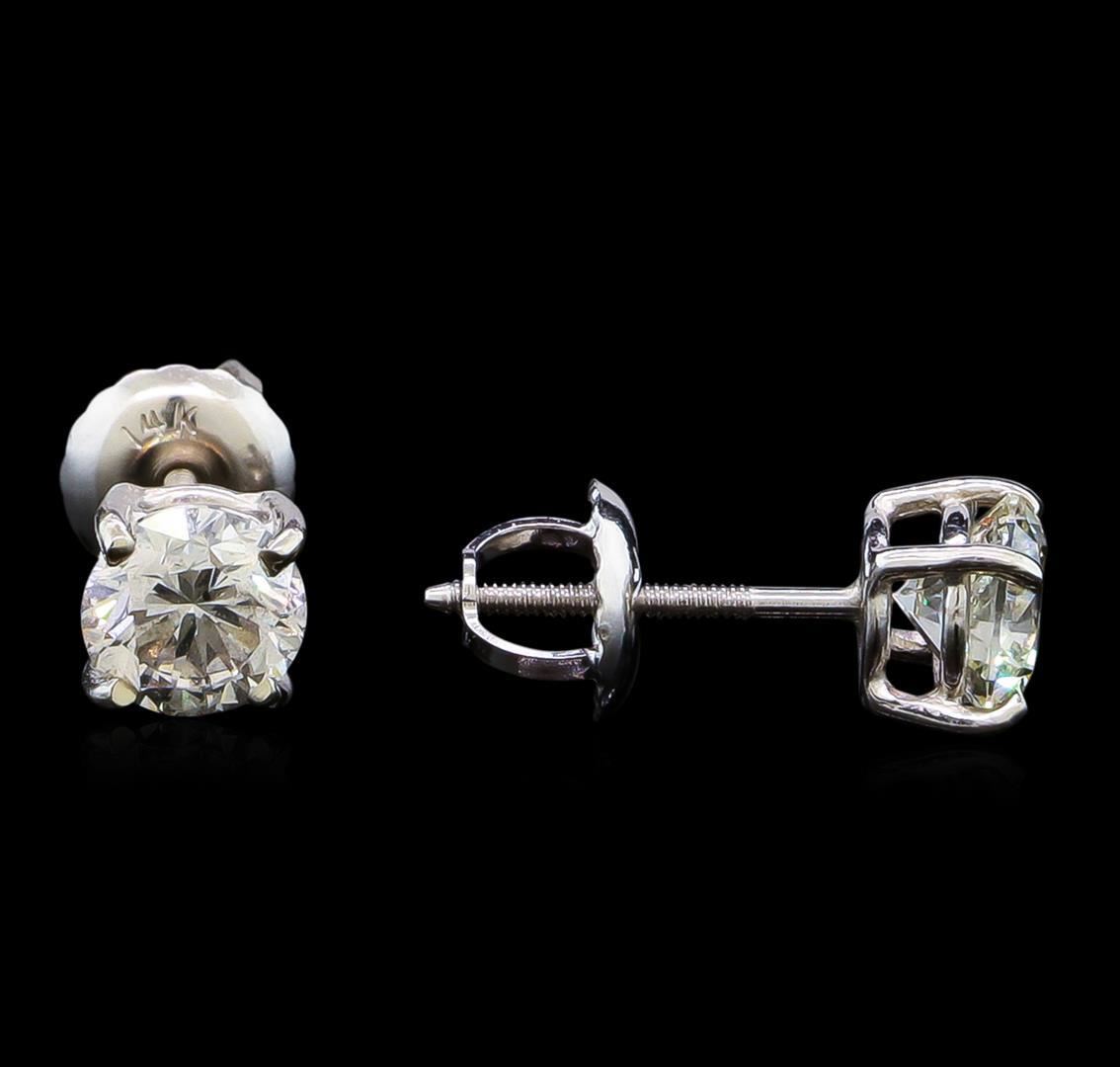 One pair electronically tested 14KT white gold lady's combination cast & assembled diamond stud earrings with threaded posts and screw-on/screw-off backs with a basket setting with a bright polish finish. Identified with markings of "14K". Condition is new, good workmanship. Containing: One prong set round brilliant cut diamond, measuring 5.04 - 5.01 x 3.22mm (depth est.) approximate weight of 0.53ct. Graded in the setting. Clarity: SI-3. Color: I. Cut Good One prong set round brilliant cut diamond, measuring 5.03 - 5.00 x 3.37mm (depth est.) approximate weight of 0.53ct. Graded in the setting. Clarity: SI-1. Color: I. Cut Good. Total Weight of Diamonds 1.06ct. Total Weight of Stud Earrings 1.00gm. GAS Appraised.