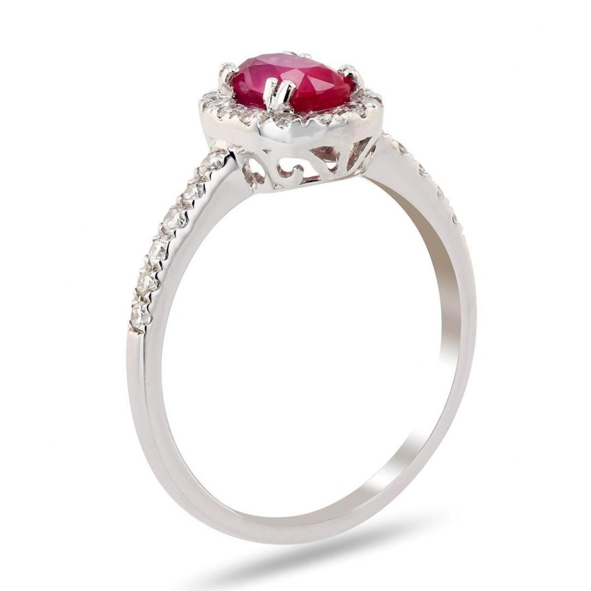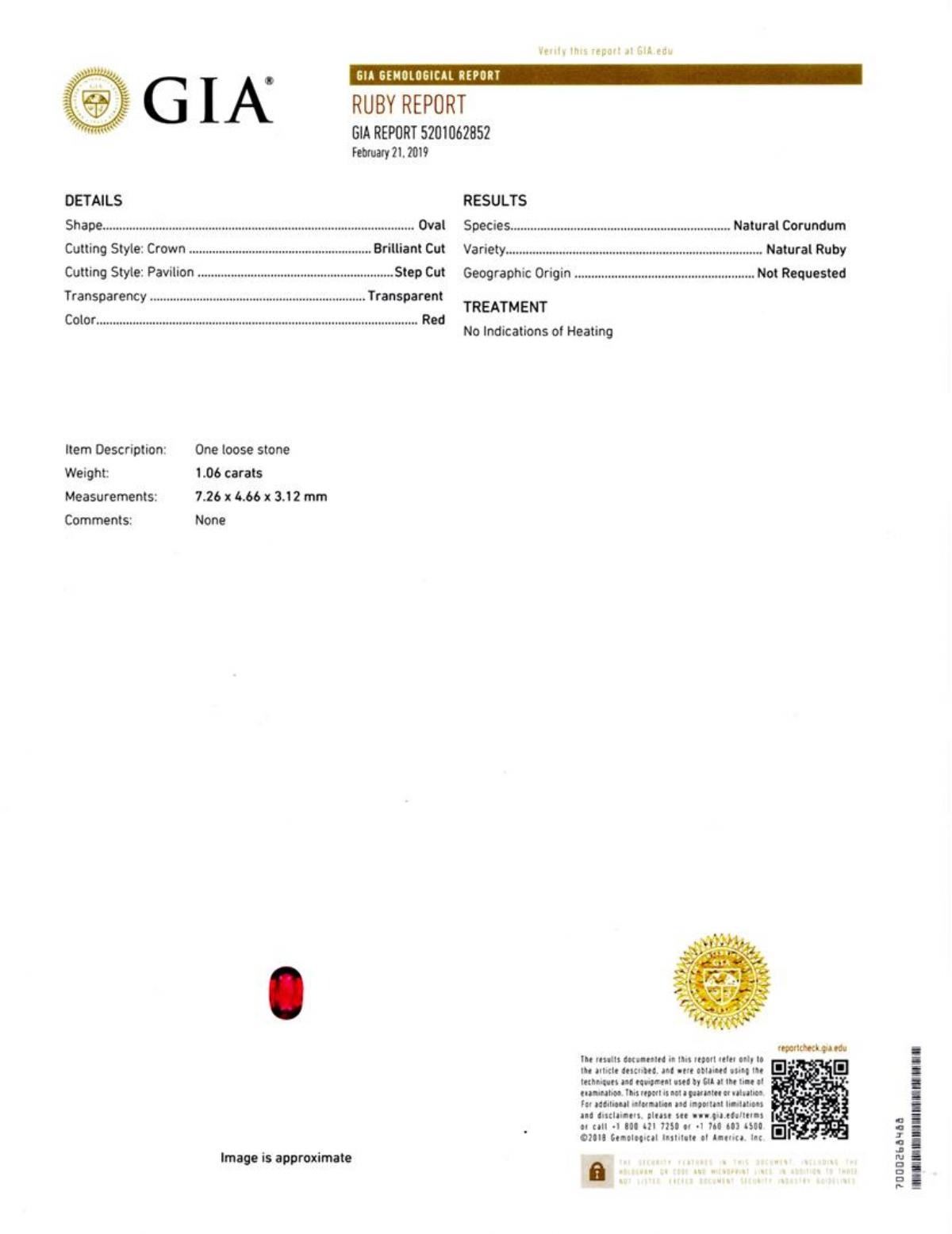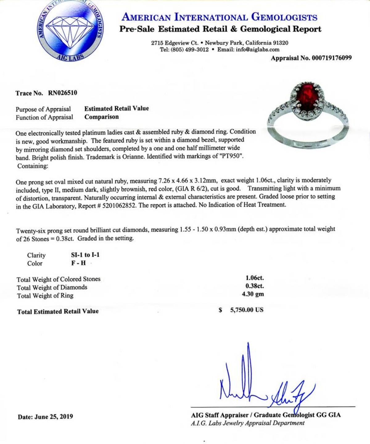 One electronically tested platinum ladies cast & assembled ruby & diamond ring. Condition is new, good workmanship. The featured ruby is set within a diamond bezel, supported by mirroring diamond set shoulders, completed by a one and one half millimeter wide band. Bright polish finish. Trademark is Orianne. Identified with markings of "PT950". Containing: One prong set oval mixed cut natural ruby, measuring 7.26 x 4.66 x 3.12mm, exact weight 1.06ct., clarity is moderately included, type II, medium dark, slightly brownish, red color, (GIA R 6/2), cut is good. Transmitting light with a minimum of distortion, transparent. Naturally occurring internal & external characteristics are present. Graded loose prior to setting in the GIA Laboratory, Report # 5201062852. The report is attached. No Indication of Heat Treatment. Twenty-six prong set round brilliant cut diamonds, measuring 1.55 - 1.50 x 0.93mm (depth est.) approximate total weight of 26 Stones = 0.38ctw. Graded in the setting. Clarity SI-1 to I-1 Color F - H Total Weight of Colored Stones 1.06ct. Total Weight of Diamonds 0.38ctw. Total Weight of Ring 4.30 gm