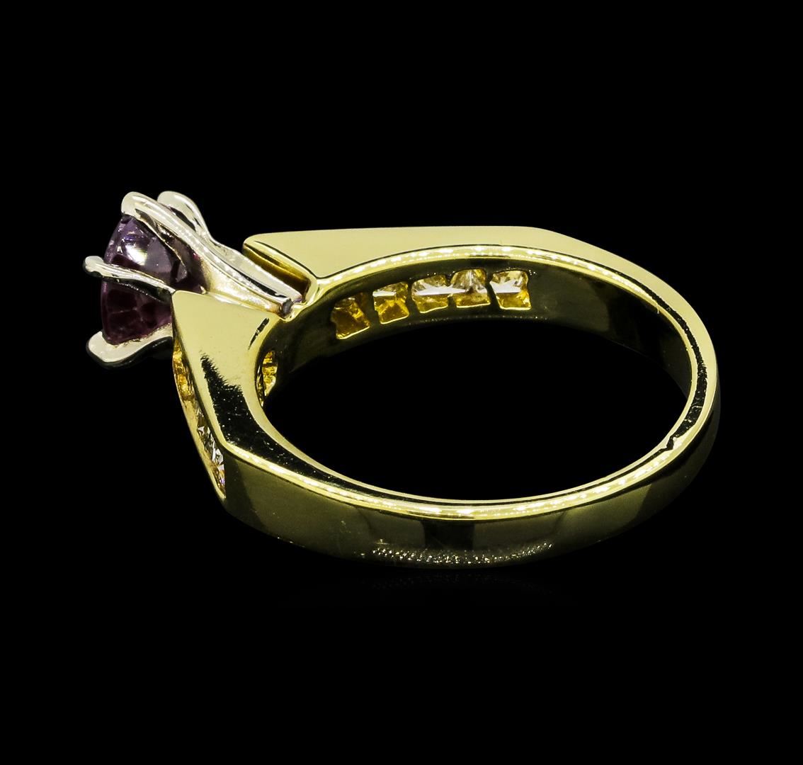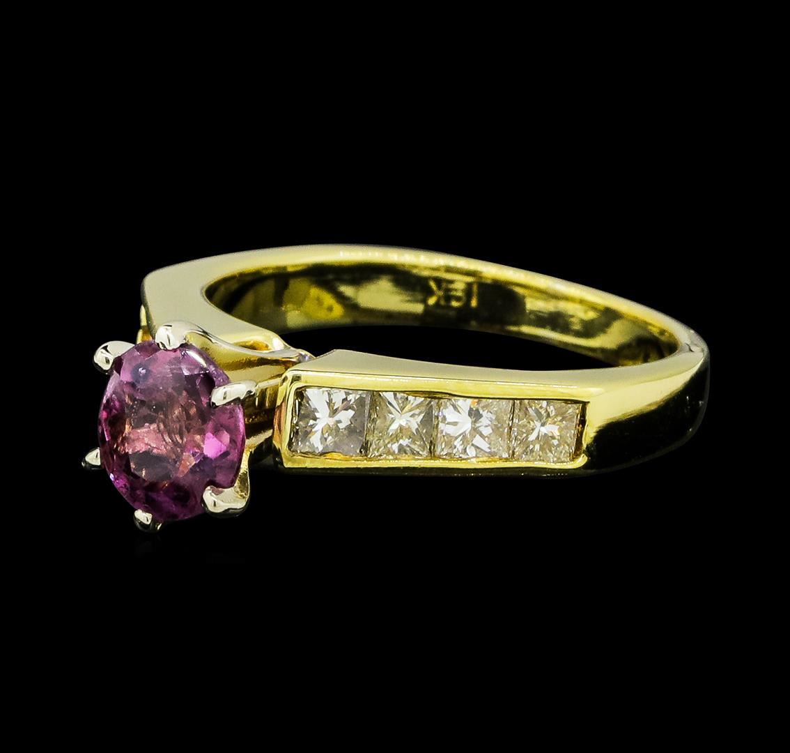 One lady's ring featuring: 18KT yellow gold weighing 4.5 grams containing one ruby weighing 1.06ct and diamonds weighing 0.50ctw.