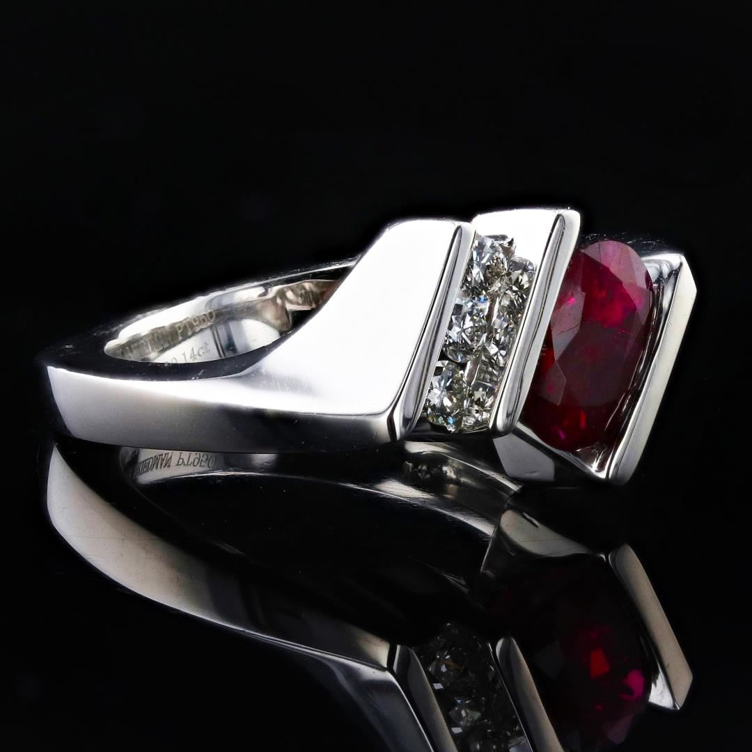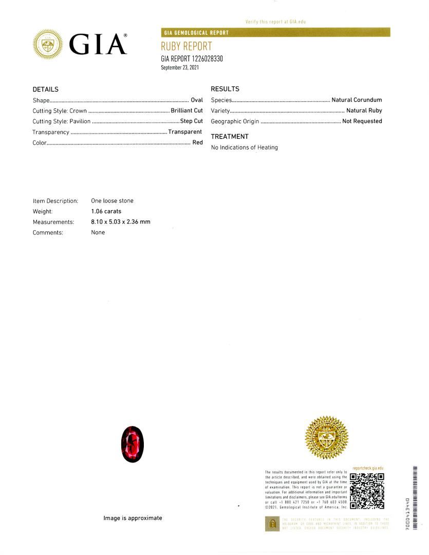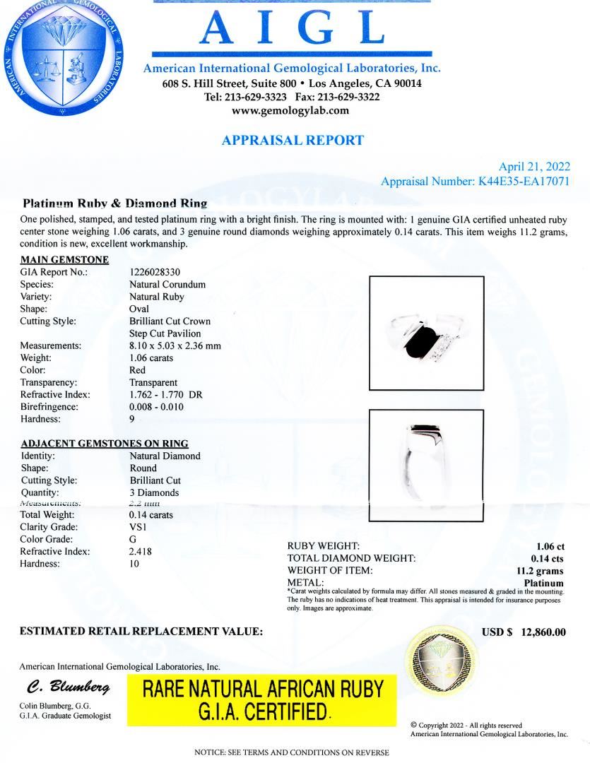 One polished, stamped, and tested platinum ring with a bright finish. The ring is mounted with: 1 genuine GIA certified unheated ruby center stone weighing 1.06 carats, and 3 genuine round diamonds weighing approximately 0.14 carats. This item weighs 11.2 grams, condition is new, excellent workmanship. #MAIN GEMSTONE# GIA Report No.: 1226028330 Species: Natural Corundum Variety: Natural Ruby Shape: Oval Cutting Style: Brilliant Cut Crown, Step Cut Pavilion Measurements: 8.10 x 5.03 x 2.36mm Weight: 1.06 carats Color: Red Transparency: Transparent Refractive Index: 1.762 - 1.770 DR Birefringence: 0.008 - 0.010 Hardness: 9 #ADJACENT GEMSTONES ON RING# Identity: Natural Diamond Shape: Round Cutting Style: Brilliant Cut Quantity: 3 Diamonds Measurements: 2.2m Total Weight: 0.14 carats Clarity Grade: VS1 Color Grade: G Refractive Index: 2.418 Hardness: 10 RUBY WEIGHT: 1.06 ct TOTAL DIAMOND WEIGHT: 0.14 cts WEIGHT OF ITEM: 11.2 grams METAL: Platinum