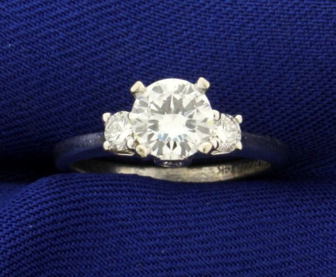 In 14k white gold, center diamond is very high quality .78ct round brilliant E color/VVS with excellent cut. Surrounded by two .1ct and two .04ct diamonds of similar very high quality. Size 4 1/2. 2.8g.