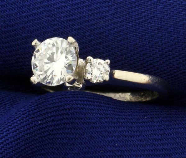 In 14k white gold, center diamond is very high quality .78ct round brilliant E color/VVS with excellent cut. Surrounded by two .1ct and two .04ct diamonds of similar very high quality. Size 4 1/2. 2.8g.