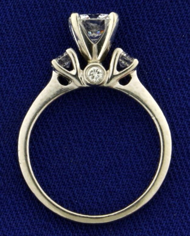 In 14k white gold, center diamond is very high quality .78ct round brilliant E color/VVS with excellent cut. Surrounded by two .1ct and two .04ct diamonds of similar very high quality. Size 4 1/2. 2.8g.