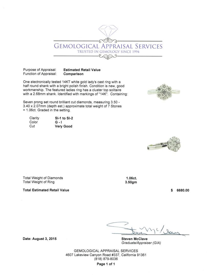 One electronically tested 14KT white gold lady's cast ring with a half round shank with a bright polish finish. The featured ladies ring has a cluster top solitaire with a 2.68mm shank. Identified with markings of "14K". Condition is new, good workmanship. Containing: Seven prong set round brilliant cut diamonds, measuring 3.50 - 3.40 x 2.07mm (depth est.) approximate total weight of 7 Stones = 1.06ct. Graded in the setting. Clarity SI-1 to SI-2 Color G - I. Cut Very Good Total Weight of Diamonds 1.06ct. Total Weight of Ring 3.50gm GAS Appraised at $6,680.00.
