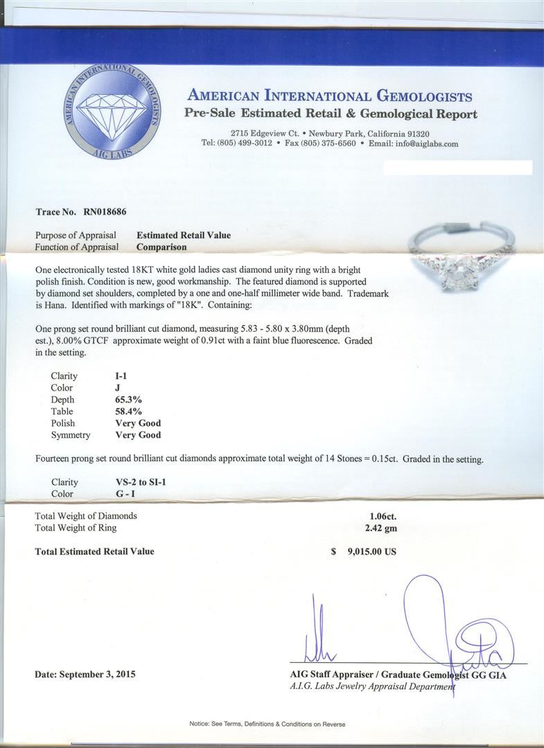 One electronically tested 18KT white gold ladies cast diamond unity ring with a bright polish finish. The featured diamond is supported by diamond set shoulders, completed by a one and one-half millimeter wide band. Trademark is Hana. Identified with markings of "18K". Condition is new, good workmanship. Containing: One prong set round brilliant cut diamond, measuring 5.83 - 5.80 x 3.80mm (depth est.), 8.00.%. GTCF approximate weight of 0.91ct with a faint blue fluorescence. Graded in the setting. Clarity: I-1. Color: J. Depth 65.3%. Table 58.4%. Fourteen prong set round brilliant cut diamonds approximate total weight of 14 Stones = 0.15ct. Graded in the setting. Clarity: VS-2 to SI-1. Color: G - I. Total Weight of Diamonds 1.06ct. Total Weight of Ring 2.42gm. AIG Appraised at $9,015.00.