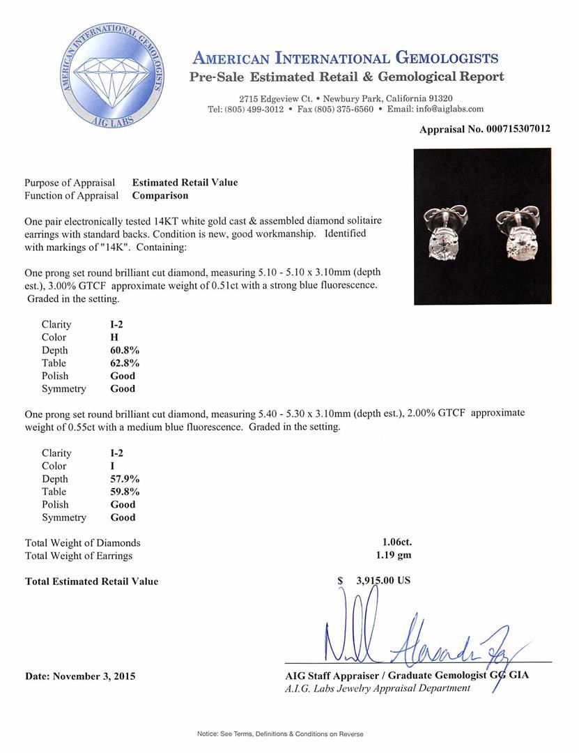 One pair electronically tested 14KT white gold cast & assembled diamond solitaire earrings with standard backs. Identified with markings of "14K". Condition is new, good workmanship. Containing: One prong set round brilliant cut diamond, measuring 5.10 - 5.10 x 3.10mm (depth est.), 3.00% GTCF approximate weight of 0.51ct with a strong blue fluorescence. Graded in the setting. Clarity: I-2. Color: 60.8%. Table 62.8%. One prong set round brilliant cut diamond, measuring 5.40 - 5.30 x 3.10mm (depth est.), 2.00% GTCF approximate weight of 0.55ct with a medium blue fluorescence. Graded in the setting. Clarity: I-2. Color: I. Depth 57.9%. Table 59.8%. Total Weight of Diamonds 1.06ct. Total Weight of Earrings 1.19gm. AIG Appraised at $3,915.00.