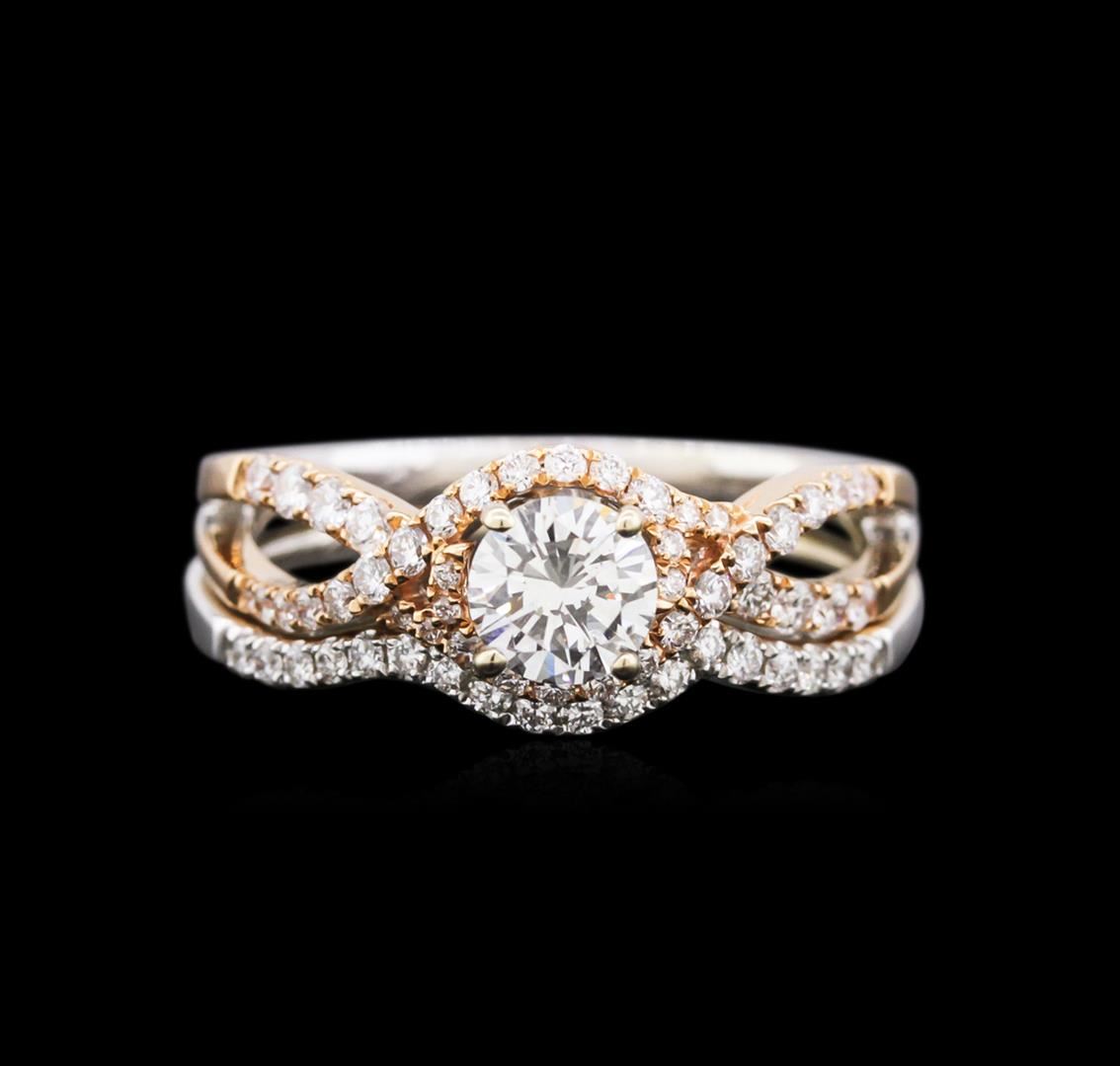 One electronically tested 18KT white and rose gold ladies cast diamond engagement ring & wedding band with a bright polish finish. Identified with markings of "18K". Condition is new. Containing: One prong set round brilliant cut diamond, measuring 5.00 - 5.00 x 3.00mm (depth est.) approximate weight of 0.46ct. Clarity: SI-1. Color: I, Cut is Good. Sixty prong set round brilliant cut diamonds, measuring 1.50 - 1.30 x 0.84mm (depth est.) approximate total weight of 60 Stones = 0.60ct. Clarity: SI-1 to SI-2. Color: H, Cut is Good. Diamonds are graded in the mounting, unless otherwise stated. Total Weight of Diamonds 1.06ct. Total Weight of Engagement Ring & Wedding Band 5.40 grams. GGL Appraised at $4,435.00.