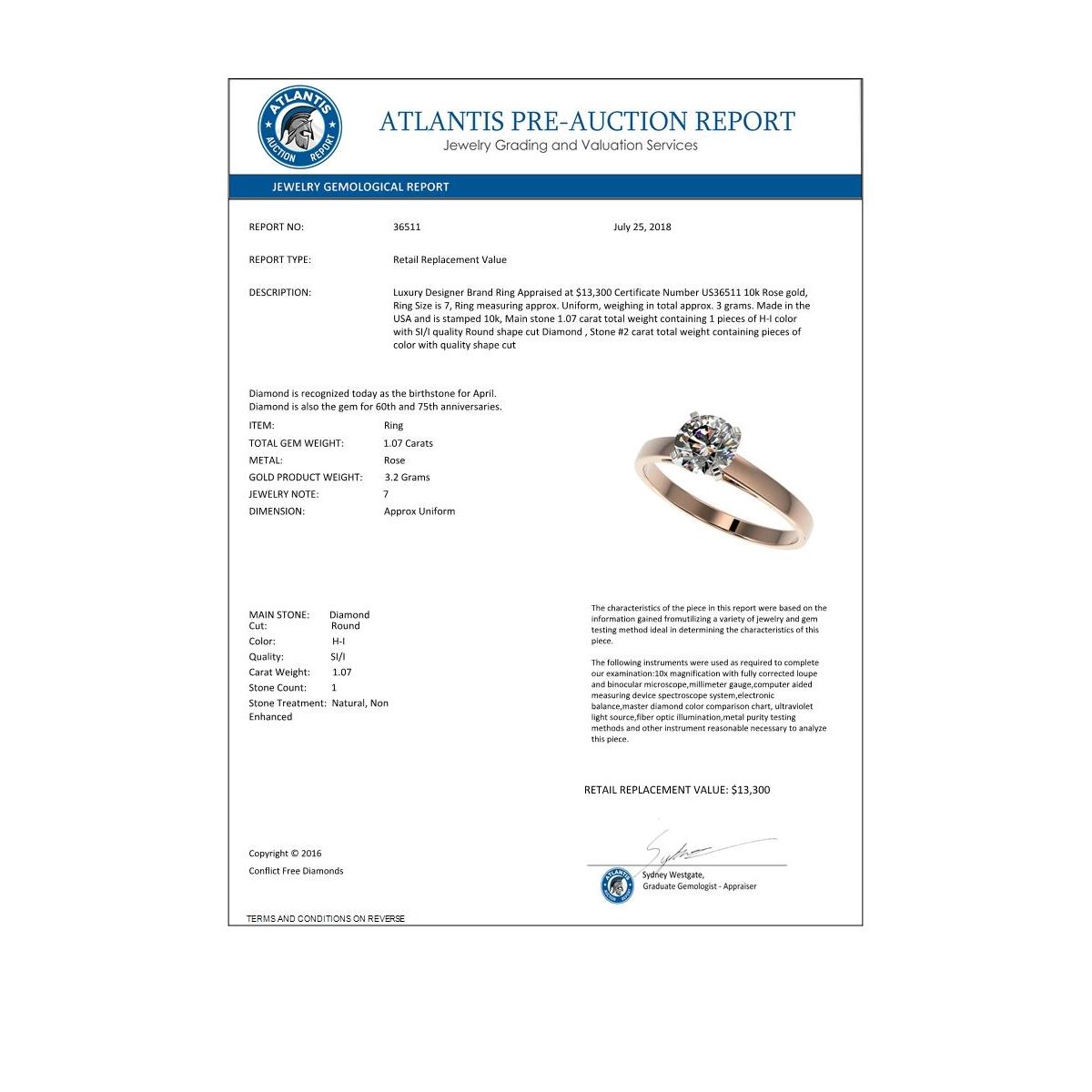 REF-199X5T -36511 ---- 1.07 CTW Certified H-SI/I Quality Diamond Solitaire Engagement Ring 10K Rose Gold ---- Luxury Designer Brand Ring Appraised at $13,300 Certificate Number US36511 10k Rose gold, Ring Size is 7, Ring measuring approx. Uniform, weighing in total approx. 3 grams. Made in the USA and is stamped 10k, Main stone 1.07 carat total weight containing 1 pieces of H-I color with SI/I quality Round shape cut Diamond , Stone #2 carat total weight containing pieces of color with quality shape cut