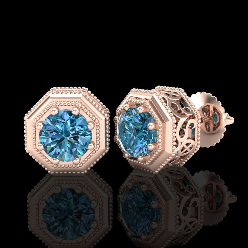 REF-118W2F -37937 ---- 1.07 CTW Fancy Intense Blue Diamond Art Deco Stud Earrings 18K Rose Gold ---- Luxury Designer Brand Earring Appraised at $7,800 Certificate Number US37937 18k Rose gold, Earring Size is Larger, Earring measuring approx. Uniform, weighing in total approx. 3 grams. Made in the USA and is stamped 18k, Main stone 1.07 carat total weight containing 2 pieces of Intense Fancy Blue color with SI quality Round shape cut Diamond , Stone #2 carat total weight containing pieces of color with quality shape cut