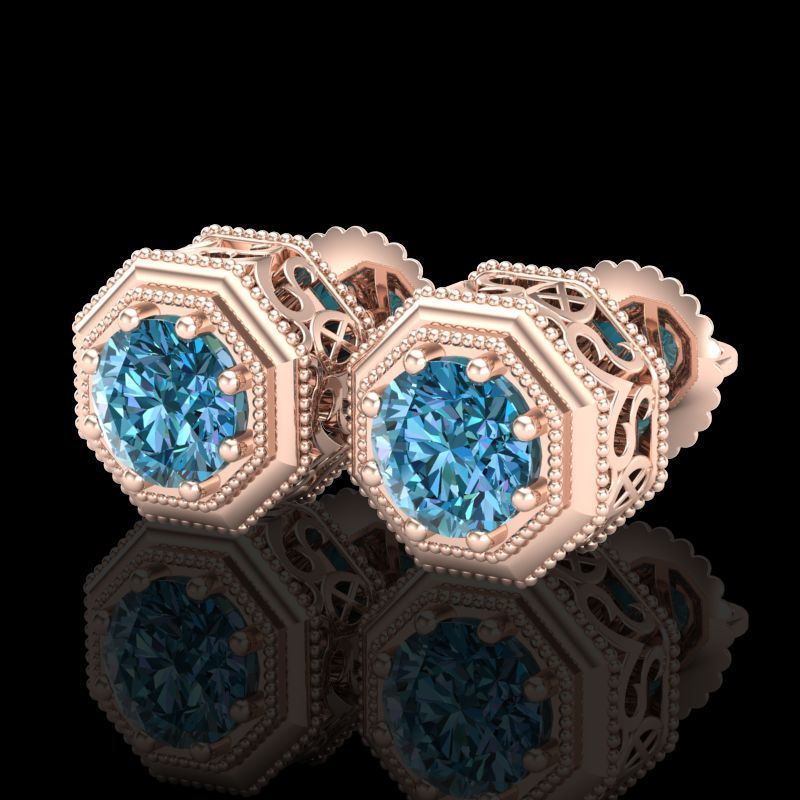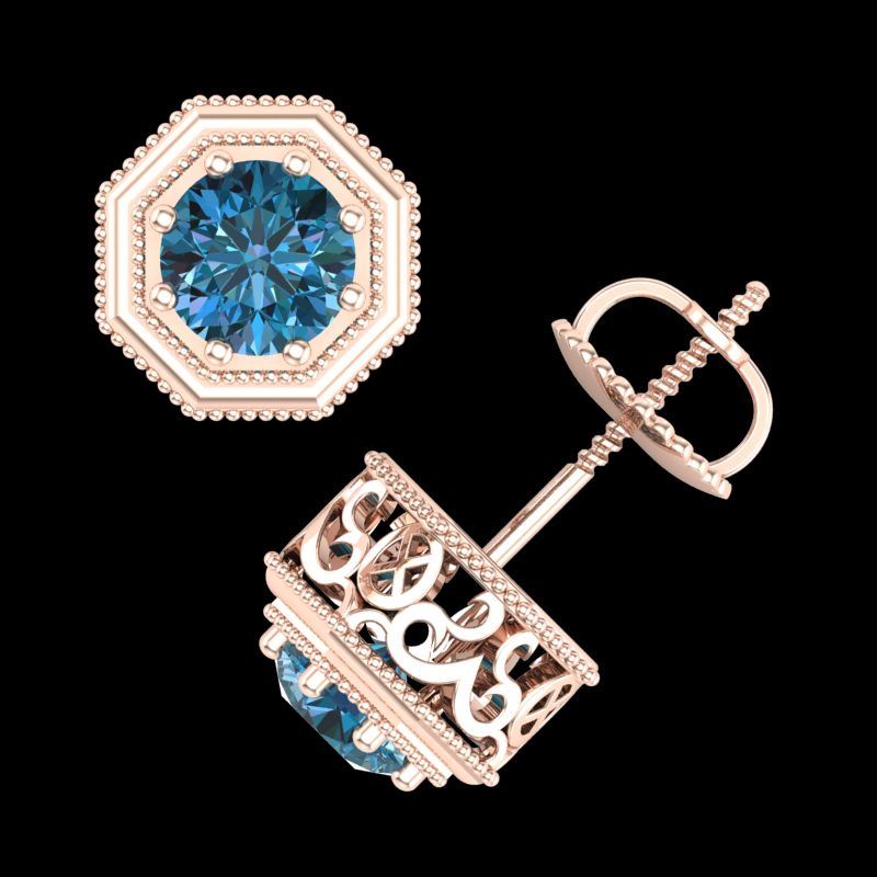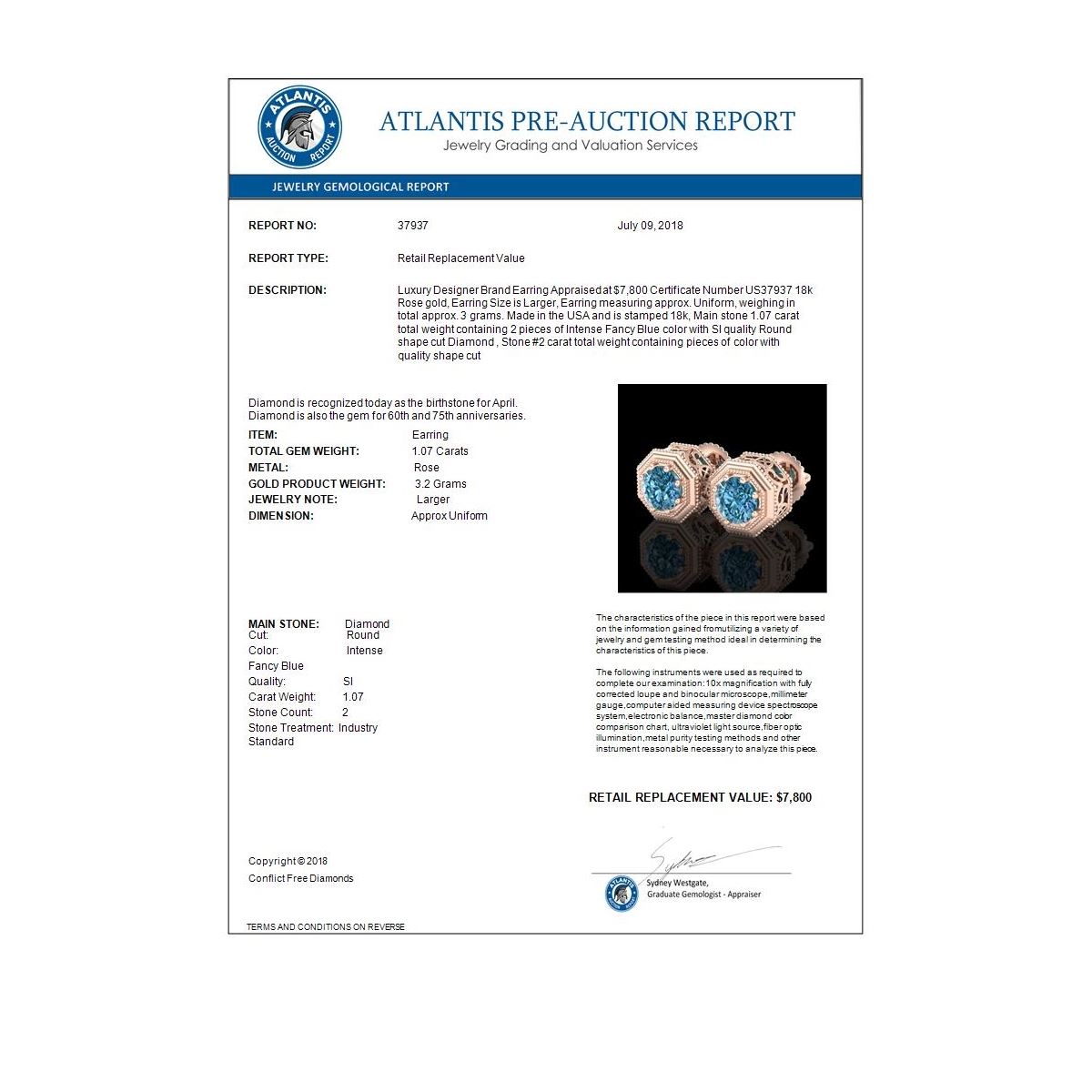 REF-118W2F -37937 ---- 1.07 CTW Fancy Intense Blue Diamond Art Deco Stud Earrings 18K Rose Gold ---- Luxury Designer Brand Earring Appraised at $7,800 Certificate Number US37937 18k Rose gold, Earring Size is Larger, Earring measuring approx. Uniform, weighing in total approx. 3 grams. Made in the USA and is stamped 18k, Main stone 1.07 carat total weight containing 2 pieces of Intense Fancy Blue color with SI quality Round shape cut Diamond , Stone #2 carat total weight containing pieces of color with quality shape cut