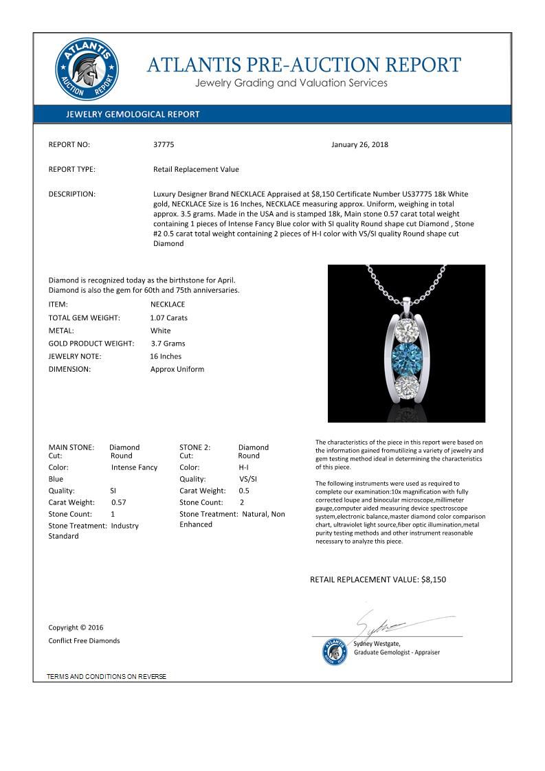 REF-123N6Y -37775 ---- 1.07 CTW Fancy Intense Blue Diamond Solitaire Art Deco Necklace 18K White Gold ---- Luxury Designer Brand NECKLACE Appraised at $8,150 Certificate Number US37775 18k White gold, NECKLACE Size is 16 Inches, NECKLACE measuring approx. Uniform, weighing in total approx. 3.5 grams. Made in the USA and is stamped 18k, Main stone 0.57 carat total weight containing 1 pieces of Intense Fancy Blue color with SI quality Round shape cut Diamond , Stone #2 0.5 carat total weight containing 2 pieces of H-I color with VS/SI quality Round shape cut Diamond