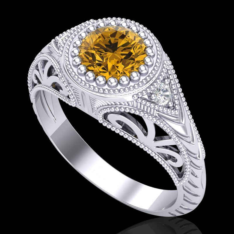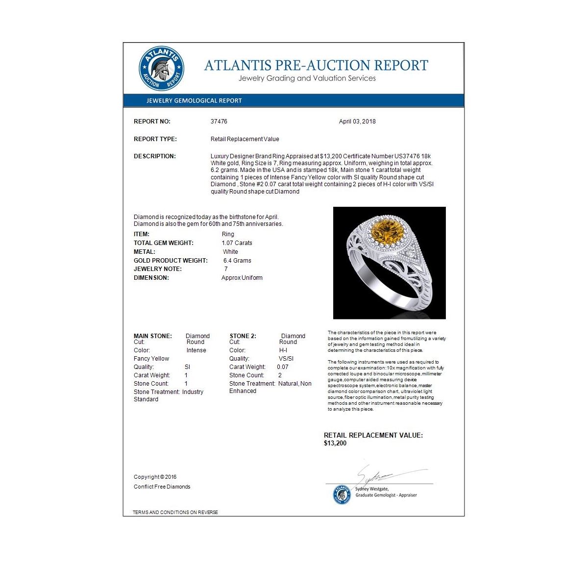 REF-200W2F -37476 ---- 1.07 CTW Intense Fancy Yellow Diamond Engagement Art Deco Ring 18K White Gold ---- Luxury Designer Brand Ring Appraised at $13,200 Certificate Number US37476 18k White gold, Ring Size is 7, Ring measuring approx. Uniform, weighing in total approx. 6.2 grams. Made in the USA and is stamped 18k, Main stone 1 carat total weight containing 1 pieces of Intense Fancy Yellow color with SI quality Round shape cut Diamond , Stone #2 0.07 carat total weight containing 2 pieces of H-I color with VS/SI quality Round shape cut Diamond