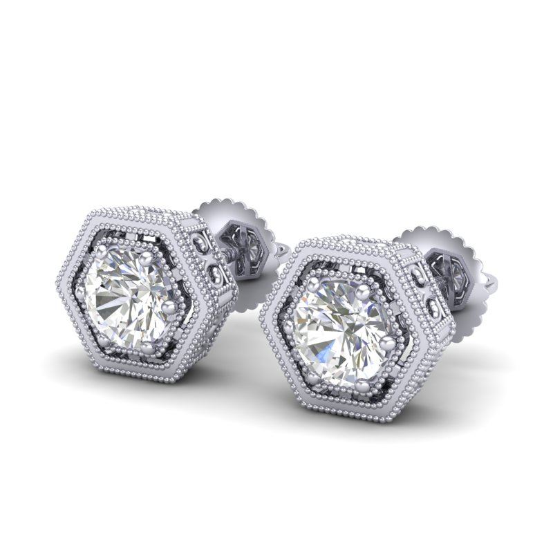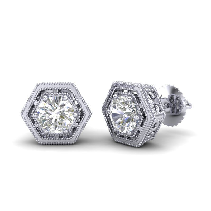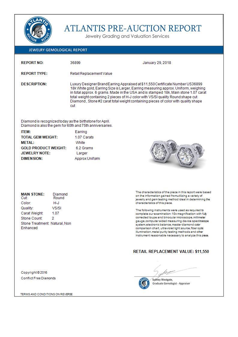 REF-190W9F -36899 ---- 1.07 CTW VS/SI Diamond Solitaire Art Deco Stud Earrings 18K White Gold ---- Luxury Designer Brand Earring Appraised at $11,550 Certificate Number US36899 18k White gold, Earring Size is Larger, Earring measuring approx. Uniform, weighing in total approx. 6 grams. Made in the USA and is stamped 18k, Main stone 1.07 carat total weight containing 2 pieces of H-J color with VS/SI quality Round shape cut Diamond , Stone #2 carat total weight containing pieces of color with quality shape cut