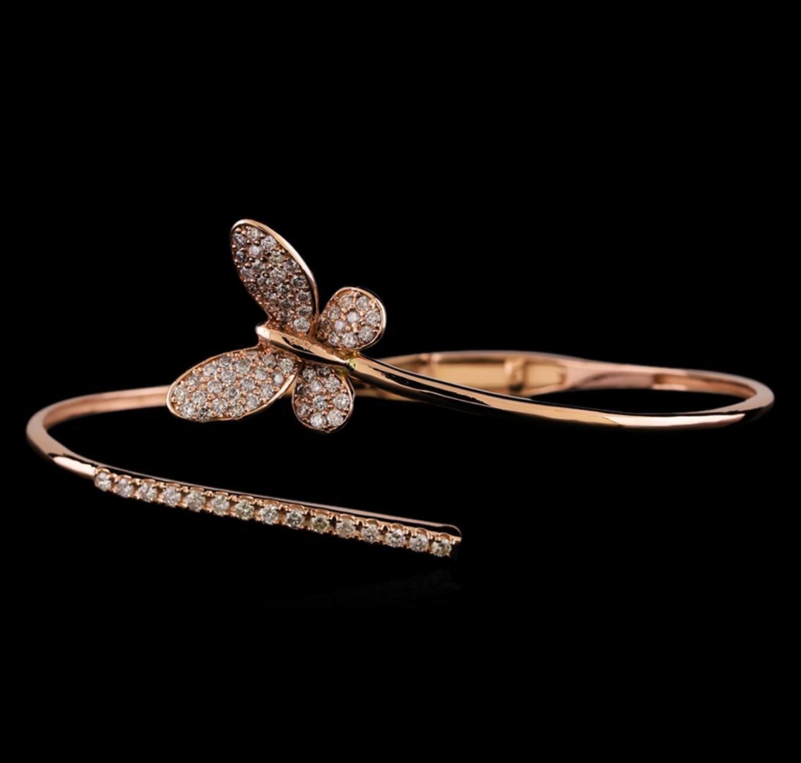One electronically tested 14KT rose gold lady's combination cast & assembled fashion cuff bracelet with a bright polish finish. The featured lady's bracelet has a butterfly motif and measures seven inches in length. Identified with markings of 'K14'. Condition is new, good workmanship. Containing: Fifteen prong set round brilliant cut diamonds, measuring 1.85 - 1.75 x 1.12mm (depth est.) approximate total weight of 15 Stones = 0.34ct. Graded in the setting. Clarity SI-1 to I-1. Color: H - I Cut Good Sixty-Two prong set round brilliant cut diamonds, measuring 1.50 - 1.40 x 0.90mm (depth est.) approximate total weight of 62 Stones = 0.73ct. Graded in the setting. Clarity SI-1 to SI-2. Color: H - I Cut Good. Total Weight of Diamonds 1.07ct.. Total Weight of Bracelet 10.10gm. GAS Appraised at $4,600.00.