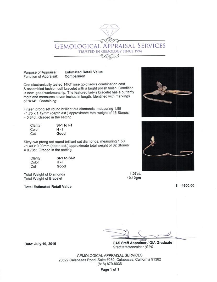 One electronically tested 14KT rose gold lady's combination cast & assembled fashion cuff bracelet with a bright polish finish. The featured lady's bracelet has a butterfly motif and measures seven inches in length. Identified with markings of 'K14'. Condition is new, good workmanship. Containing: Fifteen prong set round brilliant cut diamonds, measuring 1.85 - 1.75 x 1.12mm (depth est.) approximate total weight of 15 Stones = 0.34ct. Graded in the setting. Clarity SI-1 to I-1. Color: H - I Cut Good Sixty-Two prong set round brilliant cut diamonds, measuring 1.50 - 1.40 x 0.90mm (depth est.) approximate total weight of 62 Stones = 0.73ct. Graded in the setting. Clarity SI-1 to SI-2. Color: H - I Cut Good. Total Weight of Diamonds 1.07ct.. Total Weight of Bracelet 10.10gm. GAS Appraised at $4,600.00.