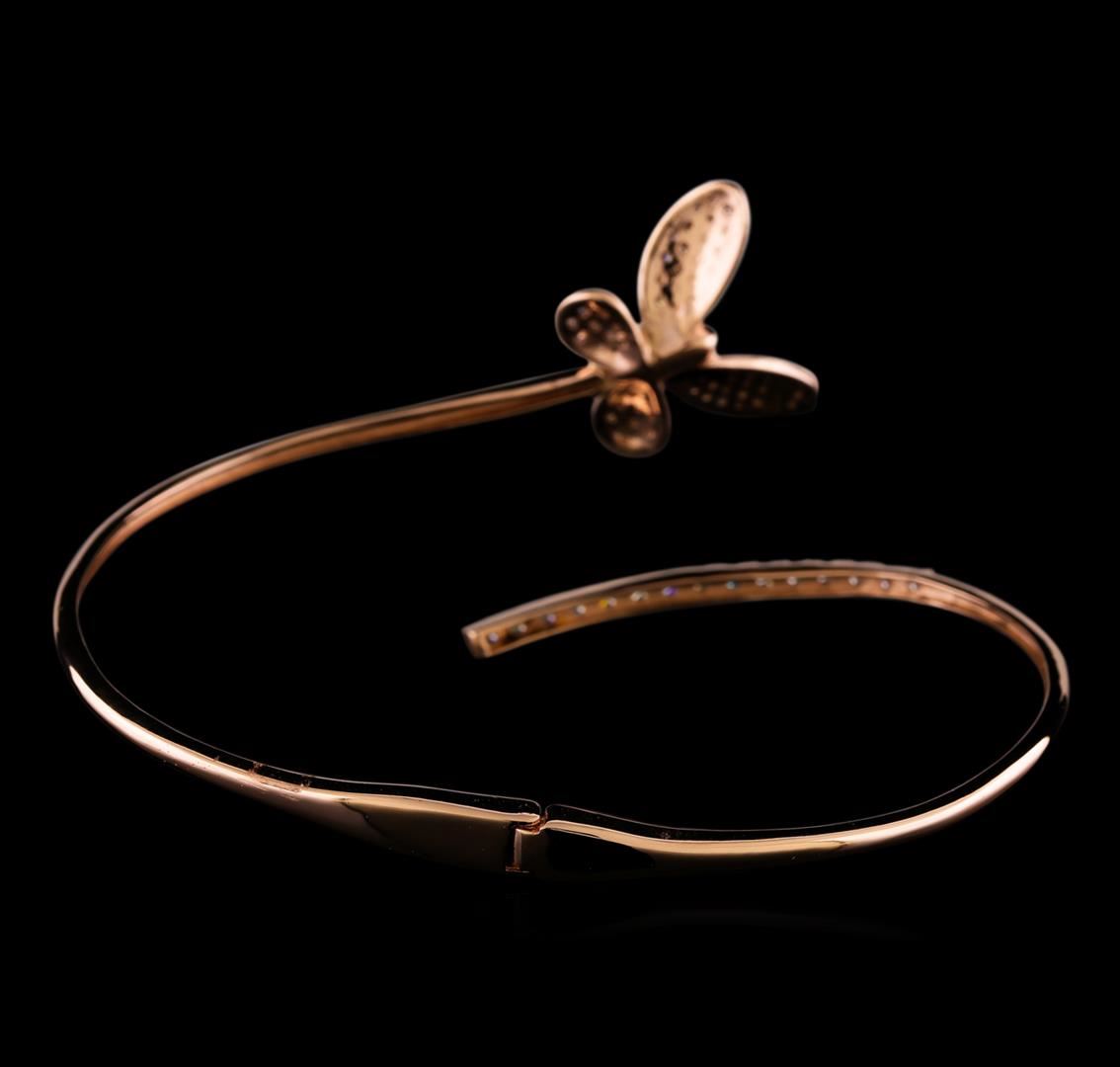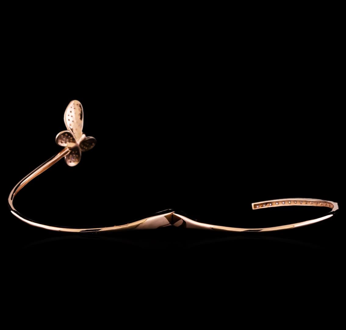 One electronically tested 14KT rose gold lady's combination cast & assembled fashion cuff bracelet with a bright polish finish. The featured lady's bracelet has a butterfly motif and measures seven inches in length. Identified with markings of 'K14'. Condition is new, good workmanship. Containing: Fifteen prong set round brilliant cut diamonds, measuring 1.85 - 1.75 x 1.12mm (depth est.) approximate total weight of 15 Stones = 0.34ct. Graded in the setting. Clarity SI-1 to I-1. Color: H - I Cut Good Sixty-Two prong set round brilliant cut diamonds, measuring 1.50 - 1.40 x 0.90mm (depth est.) approximate total weight of 62 Stones = 0.73ct. Graded in the setting. Clarity SI-1 to SI-2. Color: H - I Cut Good. Total Weight of Diamonds 1.07ct.. Total Weight of Bracelet 10.10gm. GAS Appraised at $4,600.00.