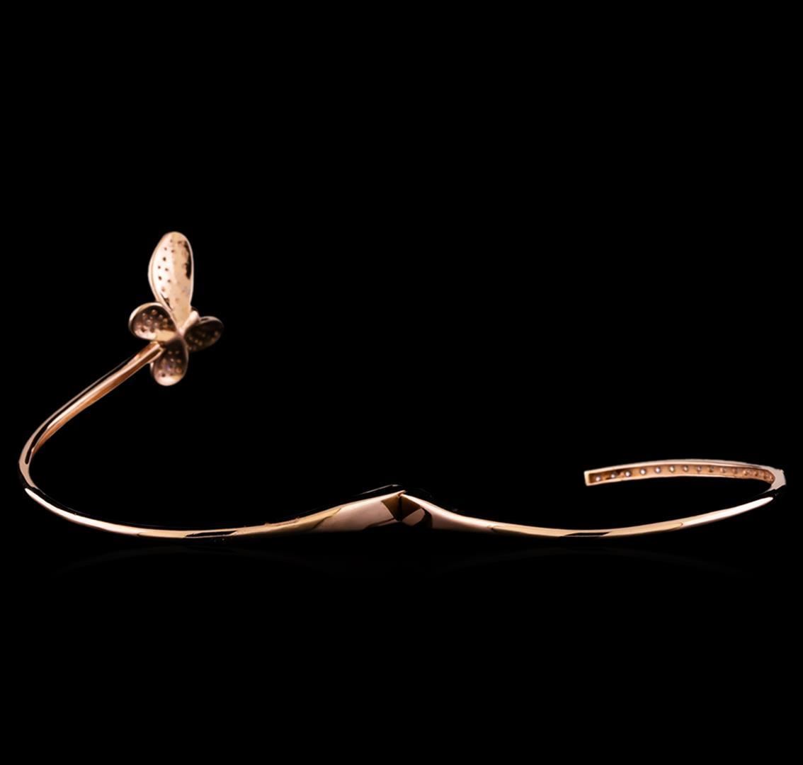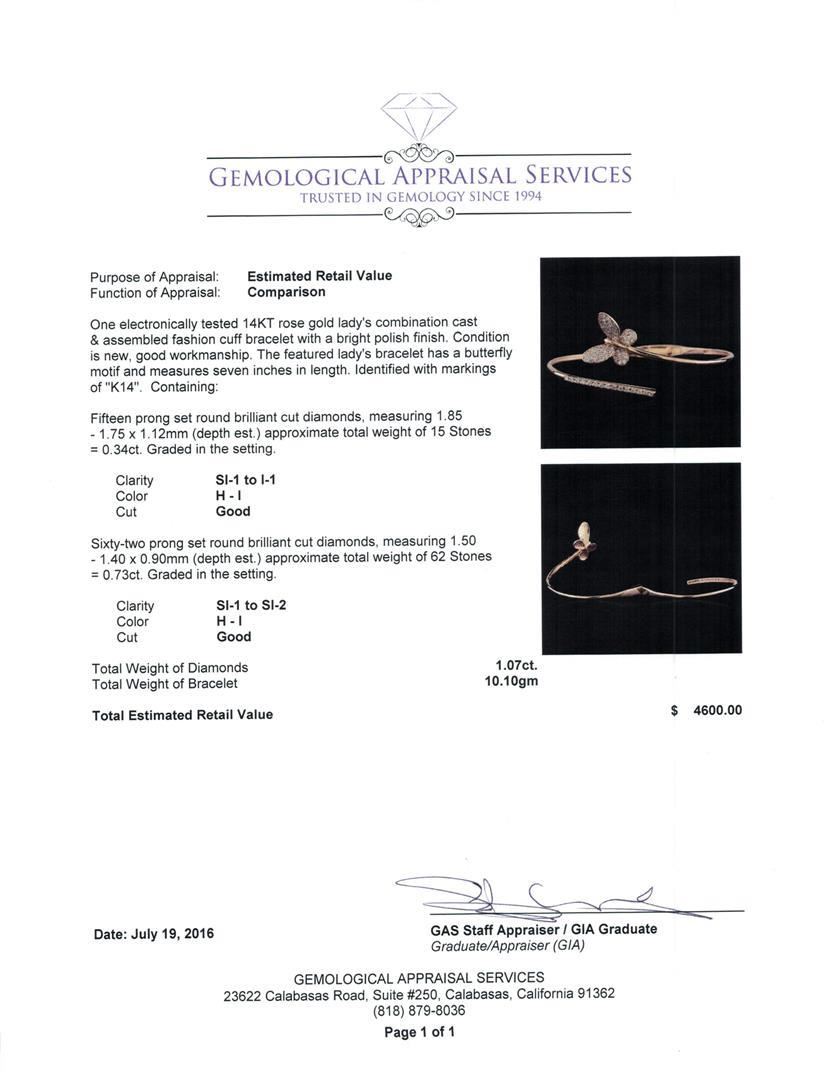 One electronically tested 14KT rose gold lady's combination cast & assembled fashion cuff bracelet with a bright polish finish. The featured lady's bracelet has a butterfly motif and measures seven inches in length. Identified with markings of 'K14'. Condition is new, good workmanship. Containing: Fifteen prong set round brilliant cut diamonds, measuring 1.85 - 1.75 x 1.12mm (depth est.) approximate total weight of 15 Stones = 0.34ct. Graded in the setting. Clarity SI-1 to I-1. Color: H - I Cut Good Sixty-Two prong set round brilliant cut diamonds, measuring 1.50 - 1.40 x 0.90mm (depth est.) approximate total weight of 62 Stones = 0.73ct. Graded in the setting. Clarity SI-1 to SI-2. Color: H - I Cut Good. Total Weight of Diamonds 1.07ct.. Total Weight of Bracelet 10.10gm. GAS Appraised.