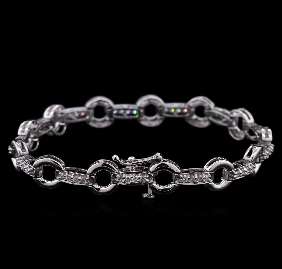 One electronically tested 14KT white gold lady's combination cast & assembled fashion bracelet with a tongue clasp with foldover safety with a bright polish finish. The featured lady's bracelet measures 7 inches in length. Identified with markings of "14K". Condition is new, good workmanship. Containing: Fifty-Two prong set round brilliant cut diamonds, measuring 1.80 - 1.70 x 1.10mm (depth est.) approximate total weight of 52 Stones = 1.07ct. Graded in the setting. Clarity: SI-1 to I-1 . Color: H - I. Cut Good. Total Weight of Diamonds 1.07ct.. Total Weight of Bracelet 11.40gm at $ 4590.00 GAS Appraised.