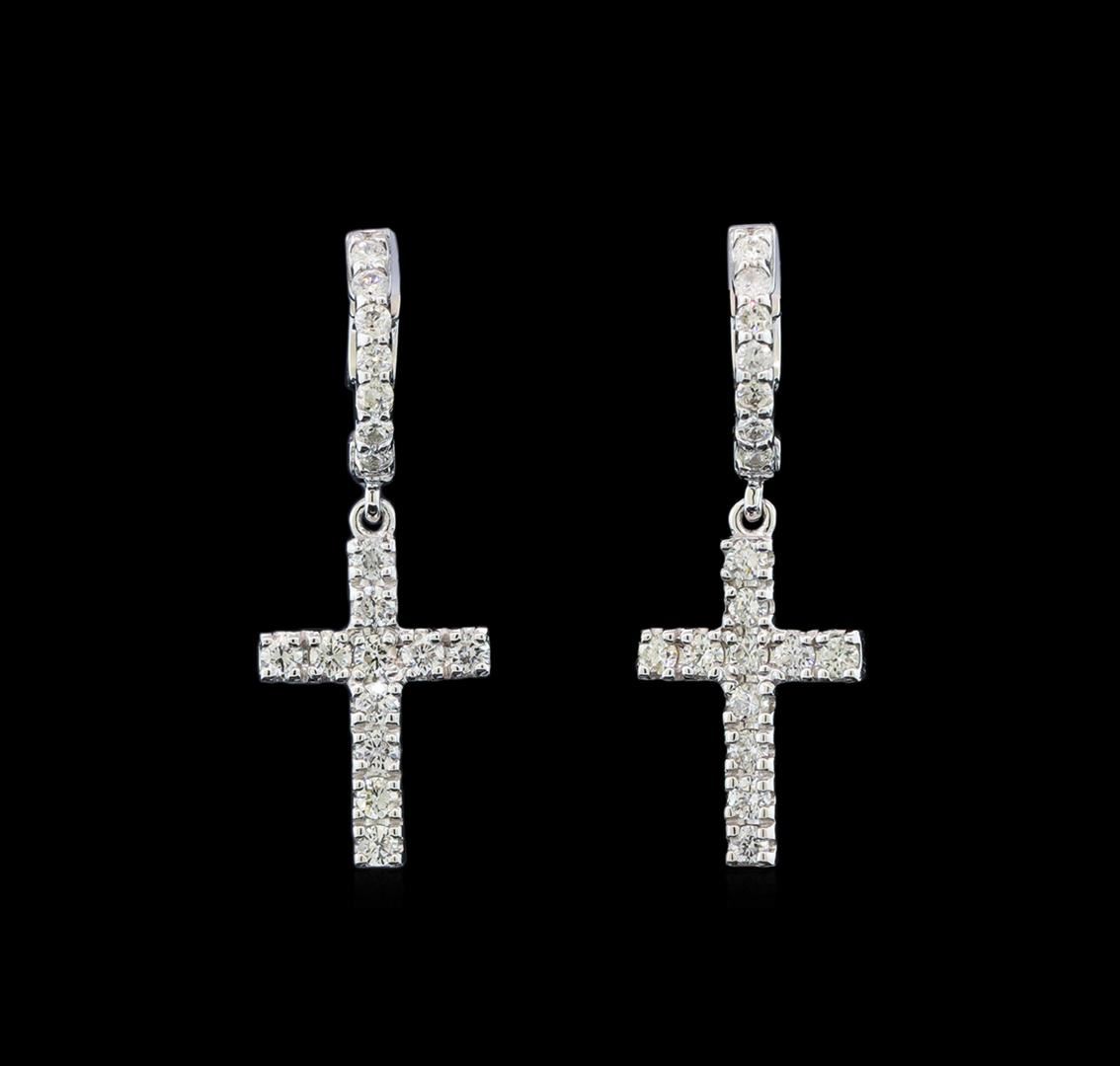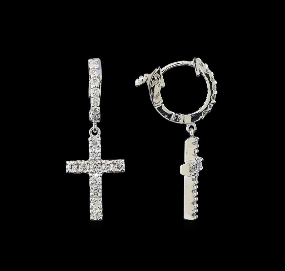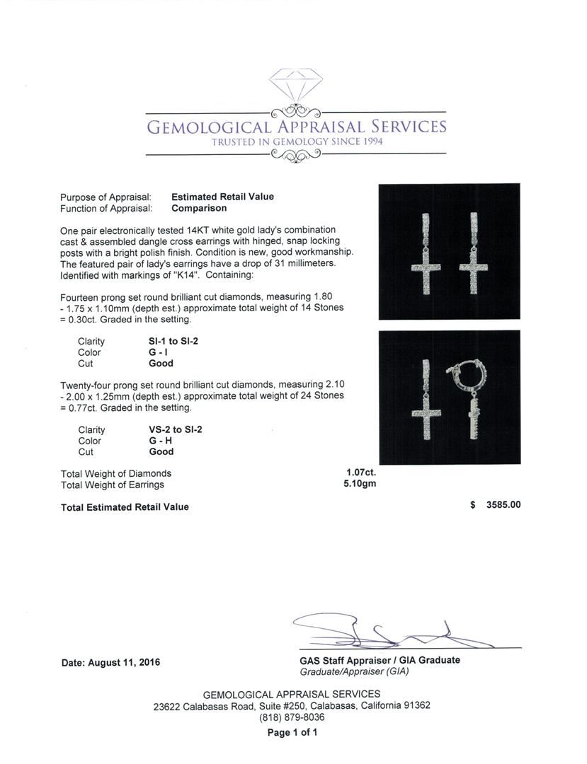 One pair electronically tested 14KT white gold lady's combination cast & assembled dangle cross earrings with hinged, snap locking posts with a bright polish finish. The featured pair of lady's earrings have a drop of 31 millimeters. Identified with markings of 'K14'. Condition is new, good workmanship. Containing: Fourteen prong set round brilliant cut diamonds, measuring 1.80 - 1.75 x 1.10mm (depth est.) approximate total weight of 14 Stones = 0.30ct. Graded in the setting. Clarity SI-1 to SI-2. Color: G - I Cut Good Twenty-Four prong set round brilliant cut diamonds, measuring 2.10 - 2.00 x 1.25mm (depth est.) approximate total weight of 24 Stones = 0.77ct. Graded in the setting. Clarity VS-2 to SI-2. Color: G - H Cut Good. Total Weight of Diamonds 1.07ct.. Total Weight of Earrings 5.10gm. GAS Appraised at $3,585.00.