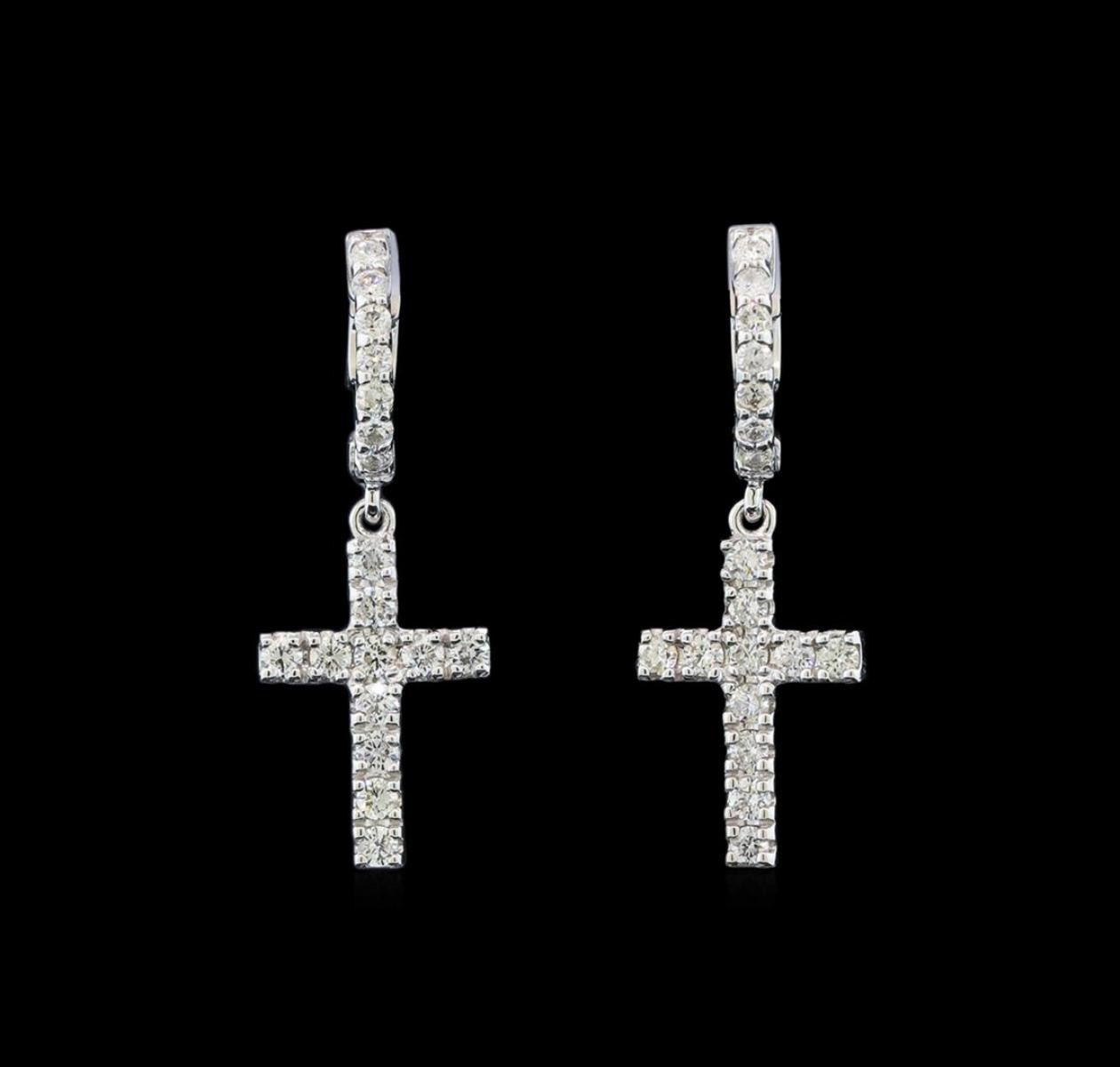 One pair electronically tested 14KT white gold lady's combination cast & assembled dangle cross earrings with hinged, snap locking posts with a bright polish finish. The featured pair of lady's earrings have a drop of 31 millimeters. Identified with markings of 'K14'. Condition is new, good workmanship. Containing: Fourteen prong set round brilliant cut diamonds, measuring 1.80 - 1.75 x 1.10mm (depth est.) approximate total weight of 14 Stones = 0.30ct. Graded in the setting. Clarity SI-1 to SI-2. Color: G - I Cut Good Twenty-Four prong set round brilliant cut diamonds, measuring 2.10 - 2.00 x 1.25mm (depth est.) approximate total weight of 24 Stones = 0.77ct. Graded in the setting. Clarity VS-2 to SI-2. Color: G - H Cut Good. Total Weight of Diamonds 1.07ct.. Total Weight of Earrings 5.10gm. GAS Appraised.