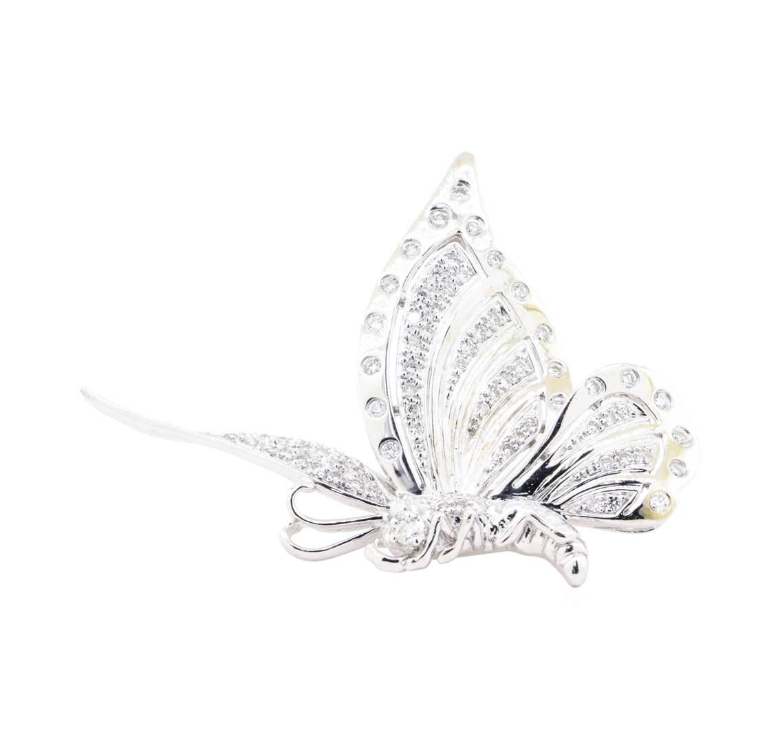 One electronically tested 18KT white gold lady's combination cast & assembled fashion butterfly pin with a bright polish finish. The featured lady's pin has foldover flip-lock clasp. Identified with markings of '18K 750'. Condition is Good. Containing: Three prong set round brilliant cut diamonds, measuring 2.20 - 2.15 x 1.35mm (depth est.) approximate total weight of 3 Stones = 0.12ct. Graded in the setting. Color H - I Clarity VS-2 to SI-1 Cut Very Good Twenty bezel set round brilliant cut diamonds, measuring 1.70 - 1.50 x 0.99mm (depth est.) approximate total weight of 20 Stones = 0.30ct. Graded in the setting. Color H - I Clarity VS-2 to SI-1 Cut Very Good Sixty-One prong set round brilliant cut diamonds, measuring 1.50 - 1.30 x 0.87mm (depth est.) approximate total weight of 61 Stones = 0.65ct. Graded in the setting. Color H - I Clarity VS-2 to SI-2 Cut Good. Total Weight of Diamonds 1.07ct.. Total Weight of Pin 15.30gm GAS Appraised at  $5510.00. GAS Appraised at $5,510.00.