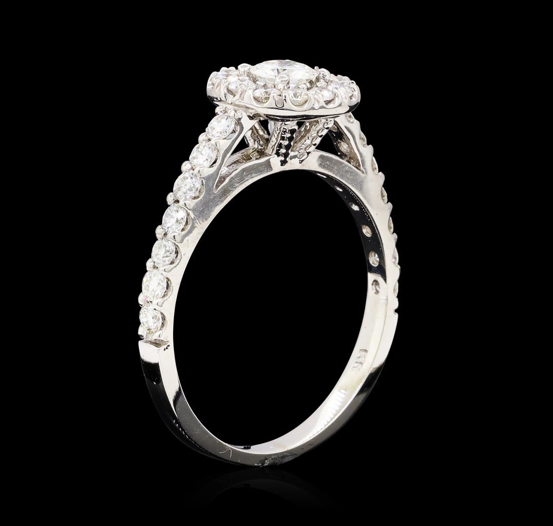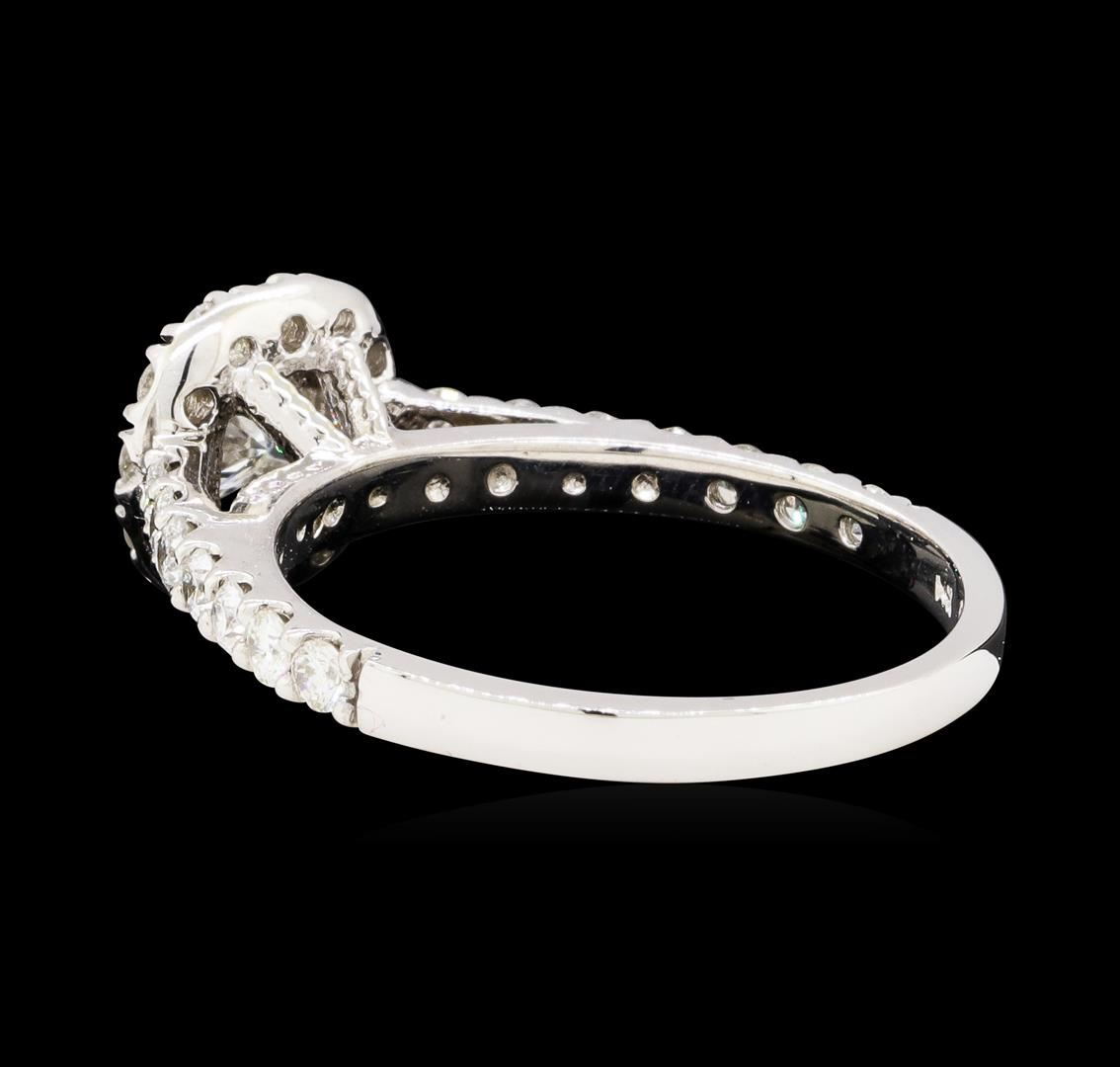 One electronically tested 14KT white gold lady's cast wedding ring with a cathedral halo with a bright polish finish. The featured lady's ring has a shank measuring 2.02 millimeters wide. Identified with markings of '14K'. Condition is new, good workmanship. Containing: One prong set round brilliant cut diamond, measuring 4.40 - 4.35 x 2.72mm (depth est.) approximate weight of 0.32ct. Graded in the setting. Color G Clarity SI-2 Cut Good Twenty-Six prong set round brilliant cut diamonds, measuring 2.00 - 1.90 x 1.21mm (depth est.) approximate total weight of 26 Stones = 0.75ct. Graded in the setting. Color G - H Clarity VS-2 to SI-1 Cut Very Good. Total Weight of Diamonds 1.07ct.. Total Weight of Ring 3.70gm GAS Appraised at $5055.00. GAS Appraised at $5,055.00.