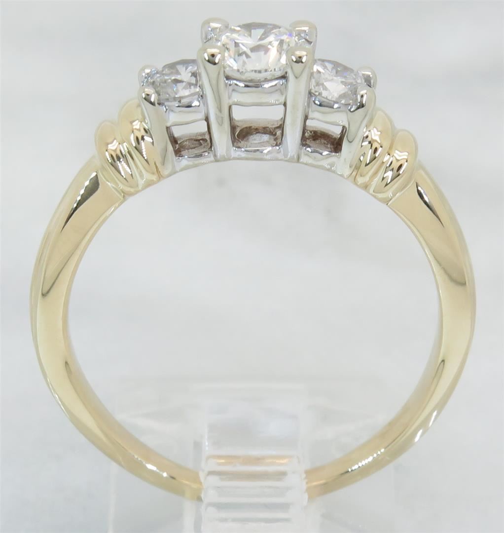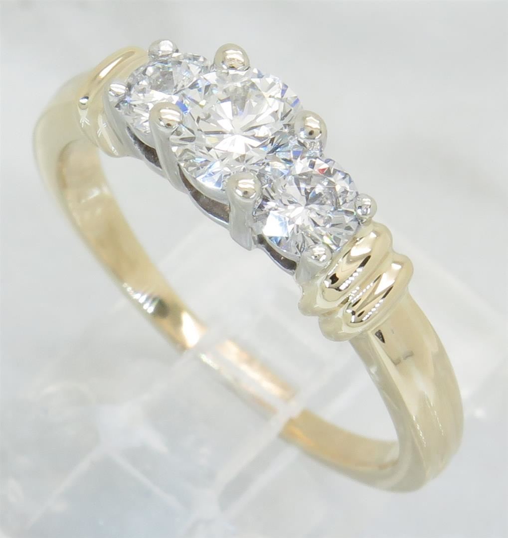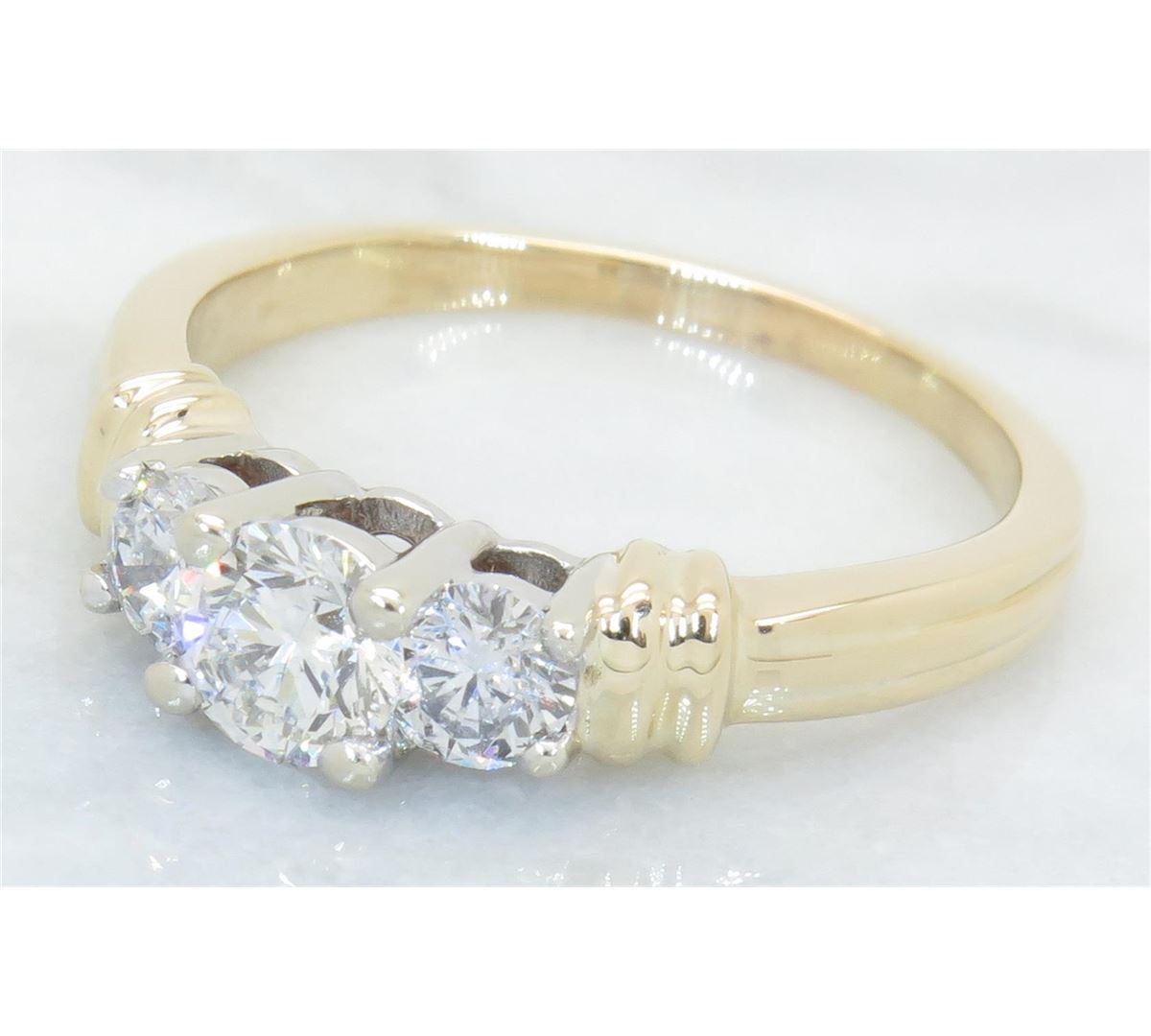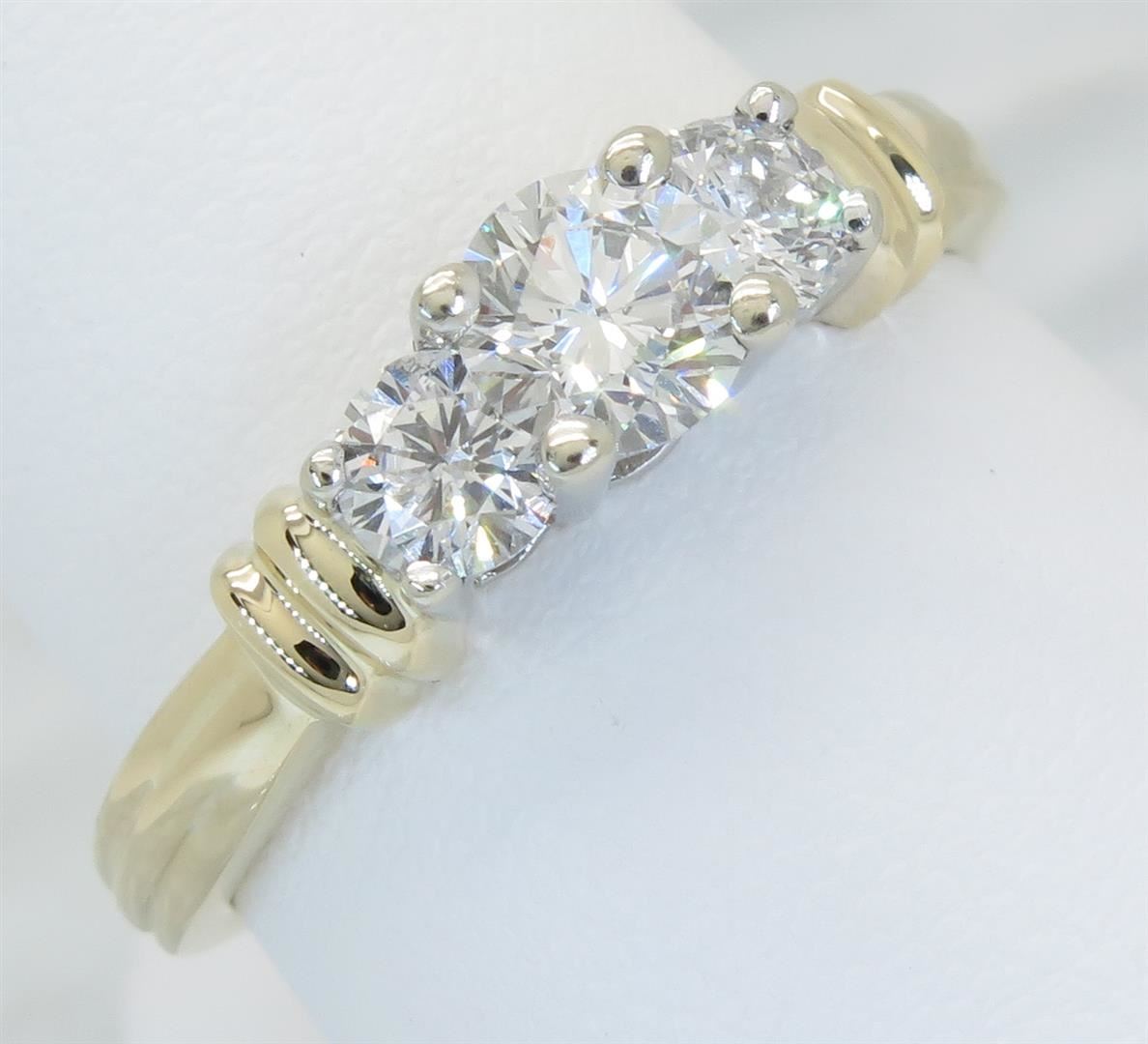 One tested 14K yellow gold diamond ring. Containing: One .56CT Round Brilliant Cut Diamond. Clarity: SI1, Color: G-H. Two Round Brilliant Cut Diamonds. Approximate total diamond weight: 1.07CTW. All diamonds are graded in the mounting unless otherwise stated. Weight of ring: 4.1 grams, Size: 7.75.