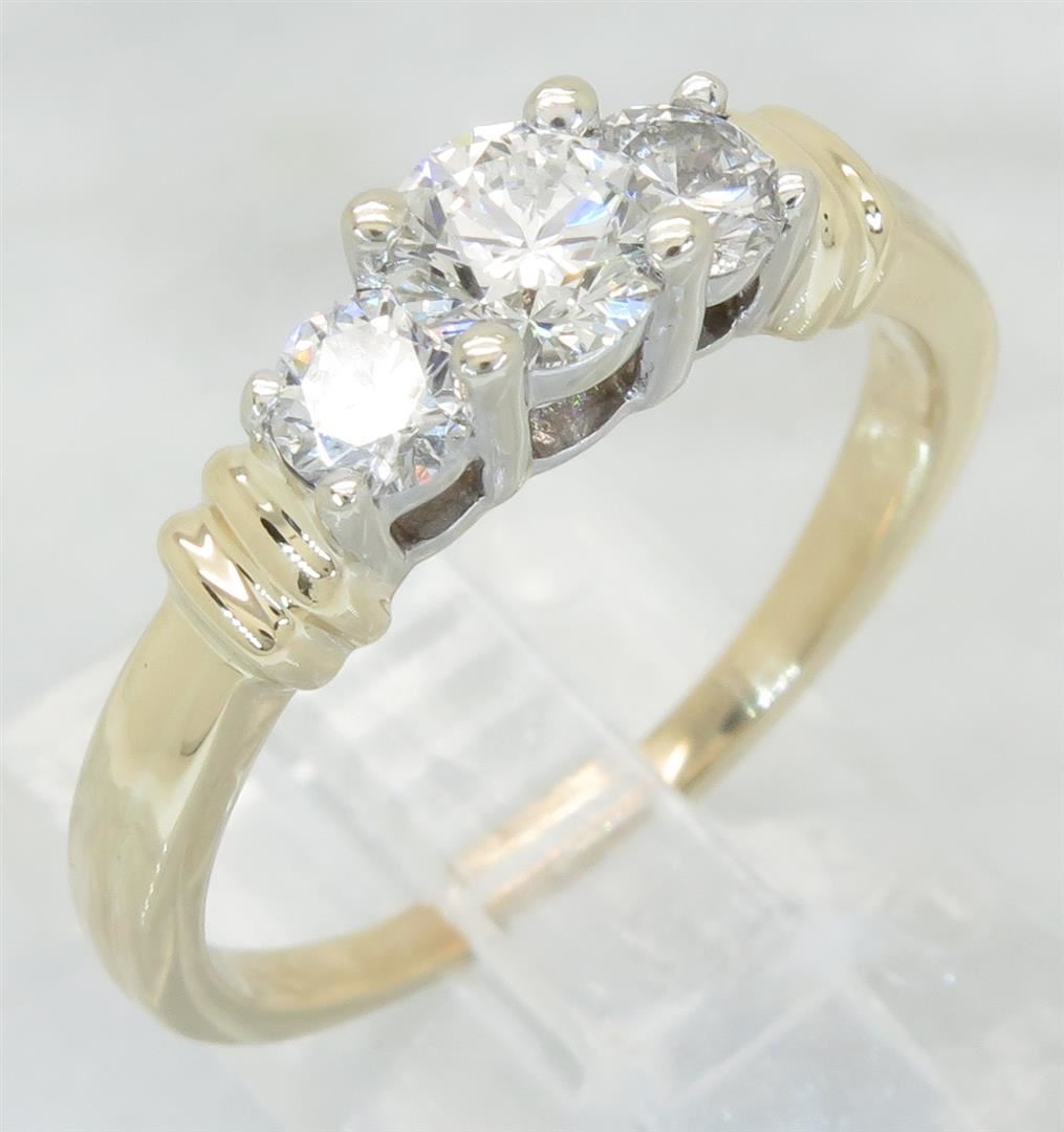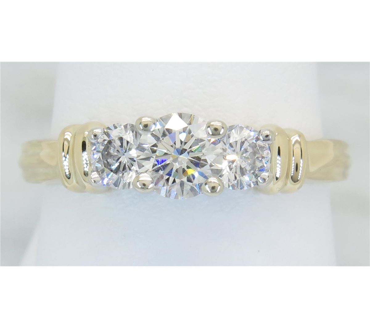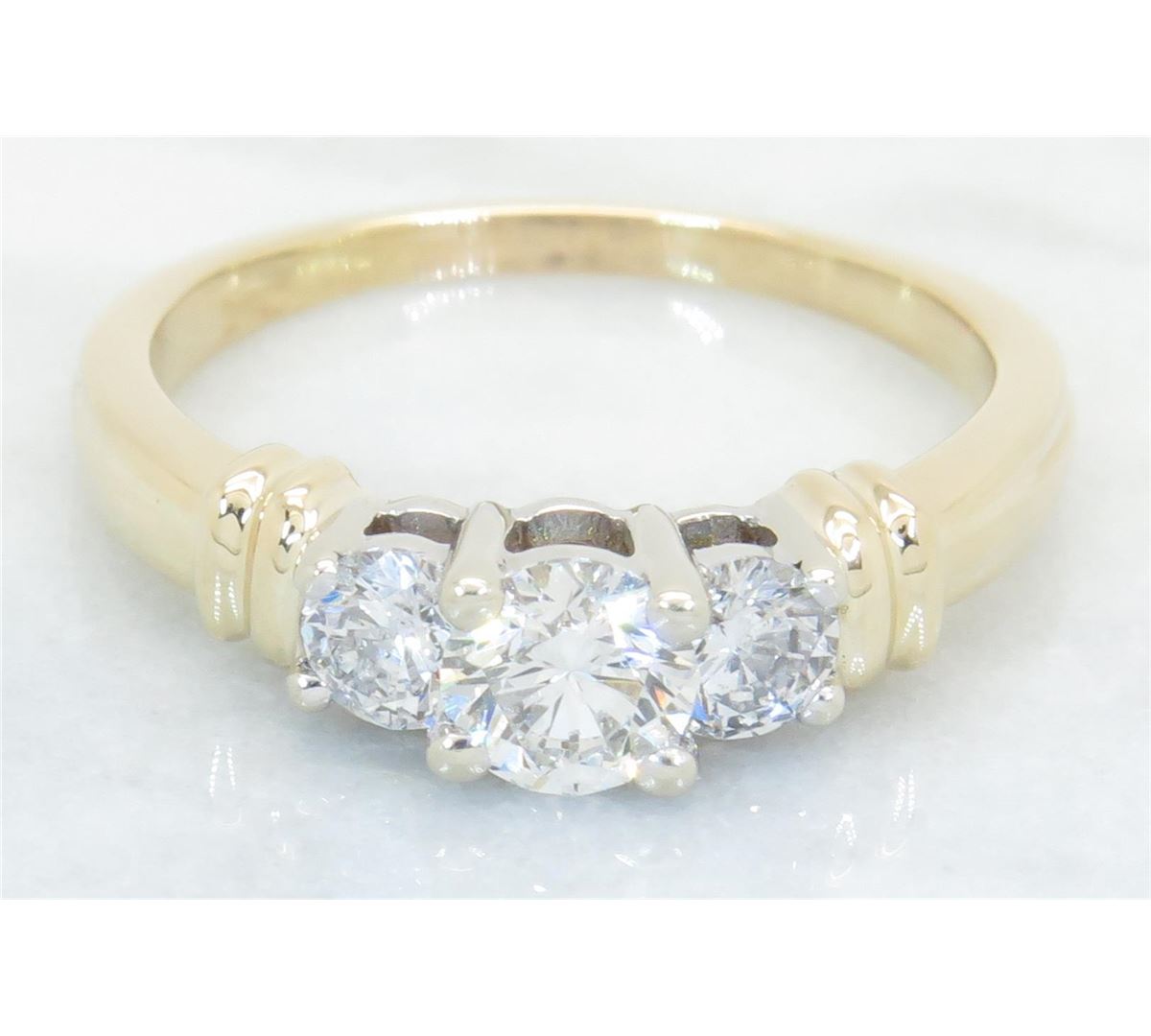 One tested 14K yellow gold diamond ring. Containing: One .56CT Round Brilliant Cut Diamond. Clarity: SI1, Color: G-H. Two Round Brilliant Cut Diamonds. Approximate total diamond weight: 1.07CTW. All diamonds are graded in the mounting unless otherwise stated. Weight of ring: 4.1 grams, Size: 7.75.