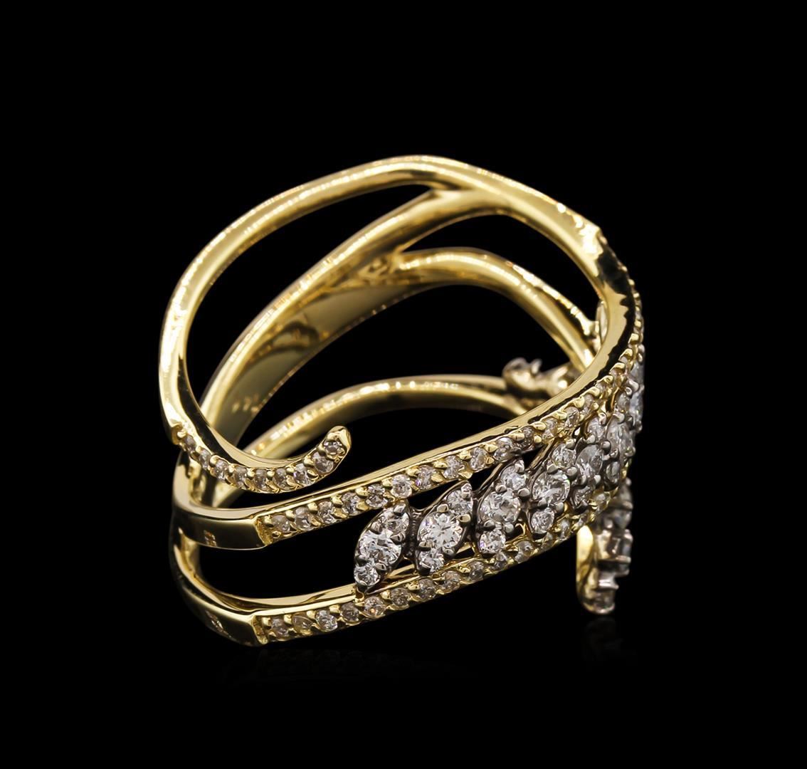 One electronically tested 14KT yellow gold ladies cast diamond ring. The ring features a series of stylized diamond ribbons, completed by multiple bands measuring twelve and one-half millimeters wide. Bright polish finish with rhodium accents. Identified with markings of "14K". Condition is new, good workmanship. Containing: One Hundred Four prong set round brilliant cut diamonds, measuring 2.50 - 1.10 x 1.08mm exact total weight 104 Stones = 1.07ct. Graded in the setting. Clarity: SI-1 to I-1. Color: G - I. Total Weight of Diamonds 1.07ct. Total Weight of Ring 6.07gm. AIG Appraised.