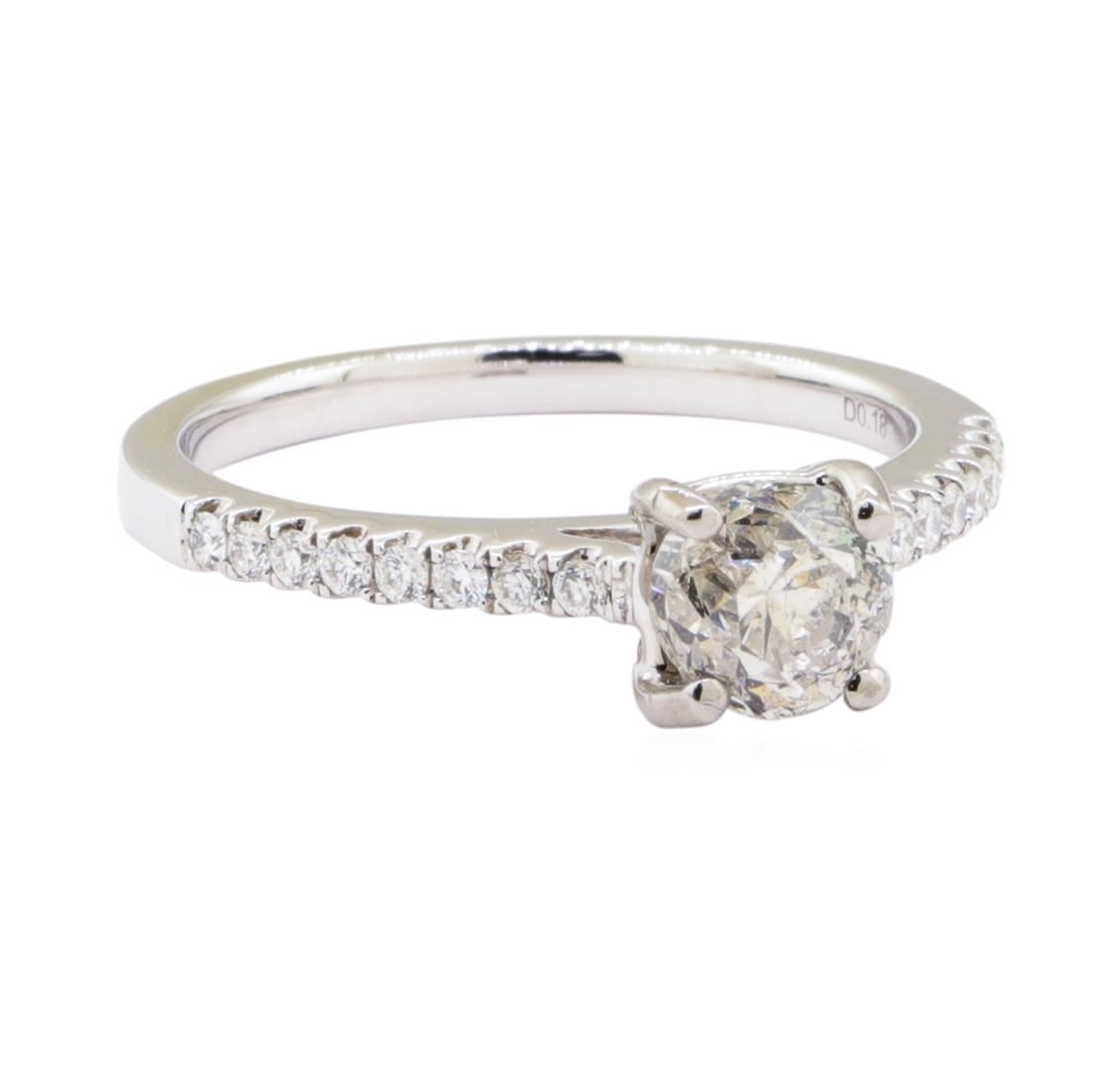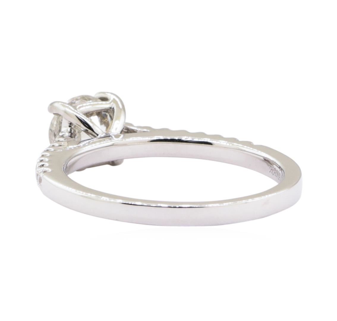 One electronically tested 18KT white gold ladies cast diamond unity ring. The featured diamond is supported by diamond ribbon shoulders, completed by a two millimeter wide band. Bright polish finish. Trademark is HANA. Identified with markings of "18K". Condition is new, good workmanship. Containing: One prong set round brilliant cut diamond, measuring 5.63 - 5.51 x 4.55mm, 24.00% GTCF exact weight 1.07ct. Graded in the EGL International Laboratory Report # EGL3410159124. Clarity I-1 Color H Depth 81.7% Table 54.0% Sixteen prong set round brilliant cut diamonds exact total weight 16 Stones = 0.18ct. Graded in the setting. Clarity SI-2 to I-1 Color F - H Total Weight of Diamonds 1.25 ct. Total Weight of Ring 3.30 gm Estimated Retail Value $ 7,080.00 US