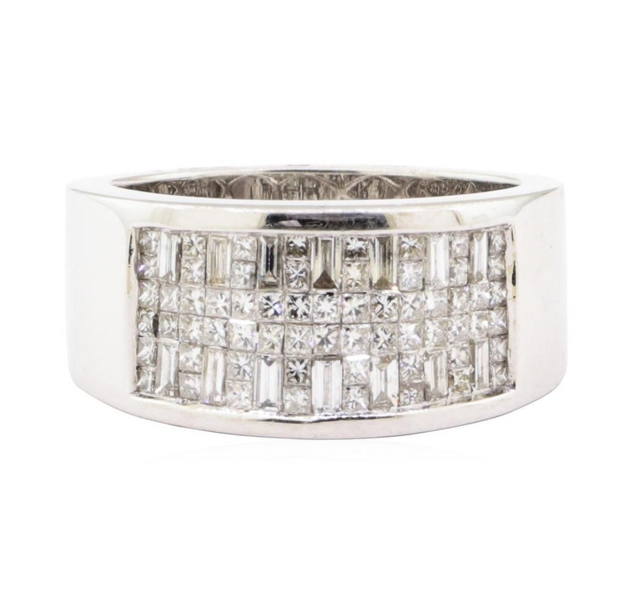 One electronically tested 18KT white gold lady's cast fashion ring with a tapered flat wide band with a bright polish finish. The featured lady's ring has a shank measuring 6.25 millimeters wide. Identified with markings of '18K'. Condition is new, good workmanship. Containing: Sixty-Two invisible set princess cut diamonds, measuring 1.20 x 1.20 x 0.90mm (depth est.) approximate total weight of 62 Stones = 0.65ct. Graded in the setting. Color I - J Clarity VS-2 to SI-1 Cut Very Good Fourteen invisible set baguette cut diamonds, measuring from 2.40 x 1.20 x 1.02mm (depth est.) to 2.50 x 1.30 x 1.11mm (depth est.) approximate total weight of 14 Stones = 0.42ct. Graded in the setting. Color H - I Clarity VS-1 to VS-2 Cut Very Good. Total Weight of Diamonds 1.07ct.. Total Weight of Ring 11.40gm GAS Appraised at $5510.00. GAS Appraised.
