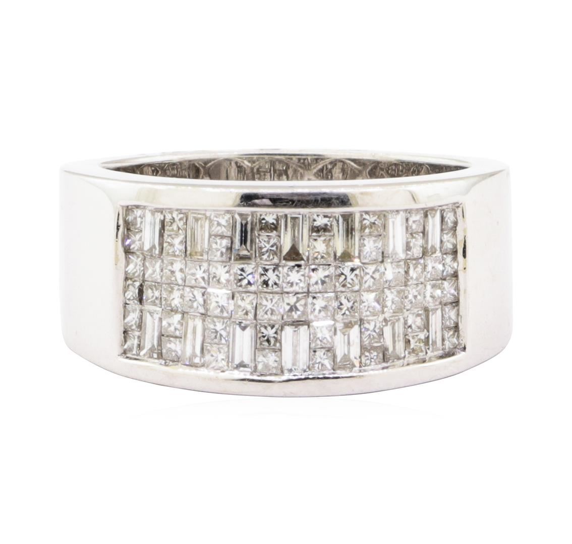One electronically tested 18KT white gold lady's cast fashion ring with a tapered flat wide band with a bright polish finish. The featured lady's ring has a shank measuring 6.25 millimeters wide. Identified with markings of '18K'. Condition is new, good workmanship. Containing: Sixty-Two invisible set princess cut diamonds, measuring 1.20 x 1.20 x 0.90mm (depth est.) approximate total weight of 62 Stones = 0.65ct. Graded in the setting. Color I - J Clarity VS-2 to SI-1 Cut Very Good Fourteen invisible set baguette cut diamonds, measuring from 2.40 x 1.20 x 1.02mm (depth est.) to 2.50 x 1.30 x 1.11mm (depth est.) approximate total weight of 14 Stones = 0.42ct. Graded in the setting. Color H - I Clarity VS-1 to VS-2 Cut Very Good. Total Weight of Diamonds 1.07ct.. Total Weight of Ring 11.40gm GAS Appraised at $5510.00. GAS Appraised.