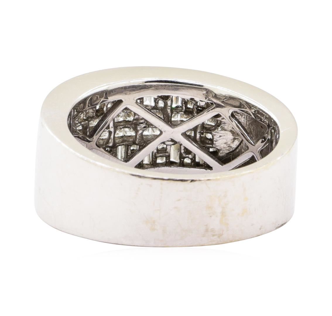 One electronically tested 18KT white gold lady's cast fashion ring with a tapered flat wide band with a bright polish finish. The featured lady's ring has a shank measuring 6.25 millimeters wide. Identified with markings of '18K'. Condition is new, good workmanship. Containing: Sixty-Two invisible set princess cut diamonds, measuring 1.20 x 1.20 x 0.90mm (depth est.) approximate total weight of 62 Stones = 0.65ct. Graded in the setting. Color I - J Clarity VS-2 to SI-1 Cut Very Good Fourteen invisible set baguette cut diamonds, measuring from 2.40 x 1.20 x 1.02mm (depth est.) to 2.50 x 1.30 x 1.11mm (depth est.) approximate total weight of 14 Stones = 0.42ct. Graded in the setting. Color H - I Clarity VS-1 to VS-2 Cut Very Good. Total Weight of Diamonds 1.07ct.. Total Weight of Ring 11.40gm GAS Appraised at $5510.00. GAS Appraised.