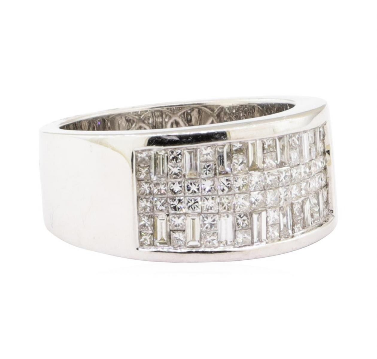 One electronically tested 18KT white gold lady's cast fashion ring with a tapered flat wide band with a bright polish finish. The featured lady's ring has a shank measuring 6.25 millimeters wide. Identified with markings of '18K'. Condition is new, good workmanship. Containing: Sixty-Two invisible set princess cut diamonds, measuring 1.20 x 1.20 x 0.90mm (depth est.) approximate total weight of 62 Stones = 0.65ct. Graded in the setting. Color I - J Clarity VS-2 to SI-1 Cut Very Good Fourteen invisible set baguette cut diamonds, measuring from 2.40 x 1.20 x 1.02mm (depth est.) to 2.50 x 1.30 x 1.11mm (depth est.) approximate total weight of 14 Stones = 0.42ct. Graded in the setting. Color H - I Clarity VS-1 to VS-2 Cut Very Good. Total Weight of Diamonds 1.07ct.. Total Weight of Ring 11.40gm GAS Appraised at $5510.00. GAS Appraised.