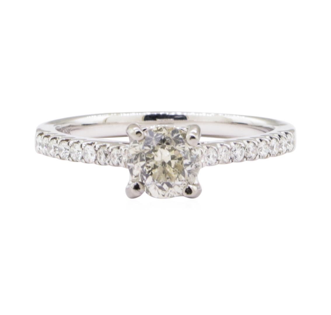 One electronically tested 18KT white gold ladies cast diamond unity ring. The featured diamond is supported by diamond ribbon shoulders, completed by a two millimeter wide band. Bright polish finish. Trademark is HANA. Identified with markings of "18K". Condition is new, good workmanship. Containing: One prong set round brilliant cut diamond, measuring 5.63 - 5.51 x 4.55mm, 24.00% GTCF exact weight 1.07ct. Graded in the EGL International Laboratory Report # EGL3410159124. Clarity I-1 Color H Depth 81.7% Table 54.0% Sixteen prong set round brilliant cut diamonds exact total weight 16 Stones = 0.18ct. Graded in the setting. Clarity SI-2 to I-1 Color F - H Total Weight of Diamonds 1.25 ct. Total Weight of Ring 3.30 gm Estimated Retail Value $ 7,080.00 US