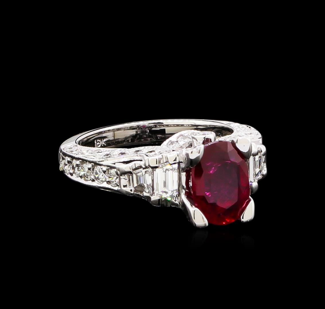 One electronically tested 18KT white gold ladies cast ruby and diamond ring. The featured ruby is set within diamond set prongs supported by a diamond under gallery and stylized diamond set shoulders, completed by a two millimeter wide band. Bright polish finish with milgrain detailing. Identified with markings of "18K". Condition is new, good workmanship. Containing: One prong set oval mixed cut natural ruby, measuring 8.50 x 6.00 x 2.50mm, approximate weight of 1.07ct., clarity is heavily included, type II, medium dark, moderately strong, slightly purplish red color, (GIA slpR 6/4), cut is good. Transmitting light somewhat diffusely, transparent to translucent. Naturally occurring internal & external characteristics are present. Graded in the setting. Four prong set baguette cut (tapered) diamonds, measuring from 2.40 x 2.20 x 1.54mm (depth est.) to 3.50 x 2.90 x 2.03mm (depth est.) approximate total weight of 4 Stones = 0.60ct. Graded in the setting. Clarity: VS-1 to VS-2. Color: H - I Fourteen prong set round brilliant cut diamonds, measuring 1.90 - 1.90 x 1.14mm (depth est.) approximate total weight of 14 Stones = 0.40ct. Graded in the setting. Clarity: SI-1 to I-1. Color: G - I Sixty-Eight prong set round brilliant and single cut diamonds, measuring 1.40 x 0.90 x 0.00mm (depth est.) approximate total weight of 68 Stones = 0.59ct. Graded in the setting. Clarity: SI-2 to I-2. Color: G - I. Total Weight of Colored Stones 1.07ct. Total Weight of Diamonds 1.59ct. Total Weight of Ring 6.23gm. AIG Appraised at $7,380.00.